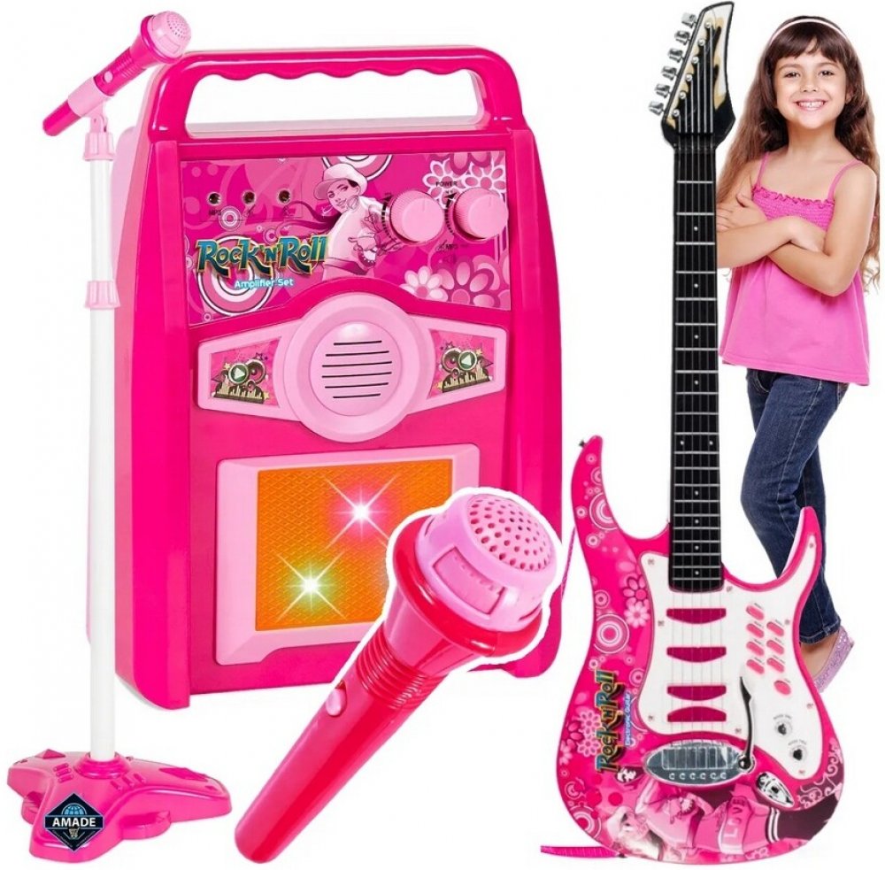 Kruzzel 22407 Dětská rocková elektrická kytara a zesilovač a mikrofon růžová