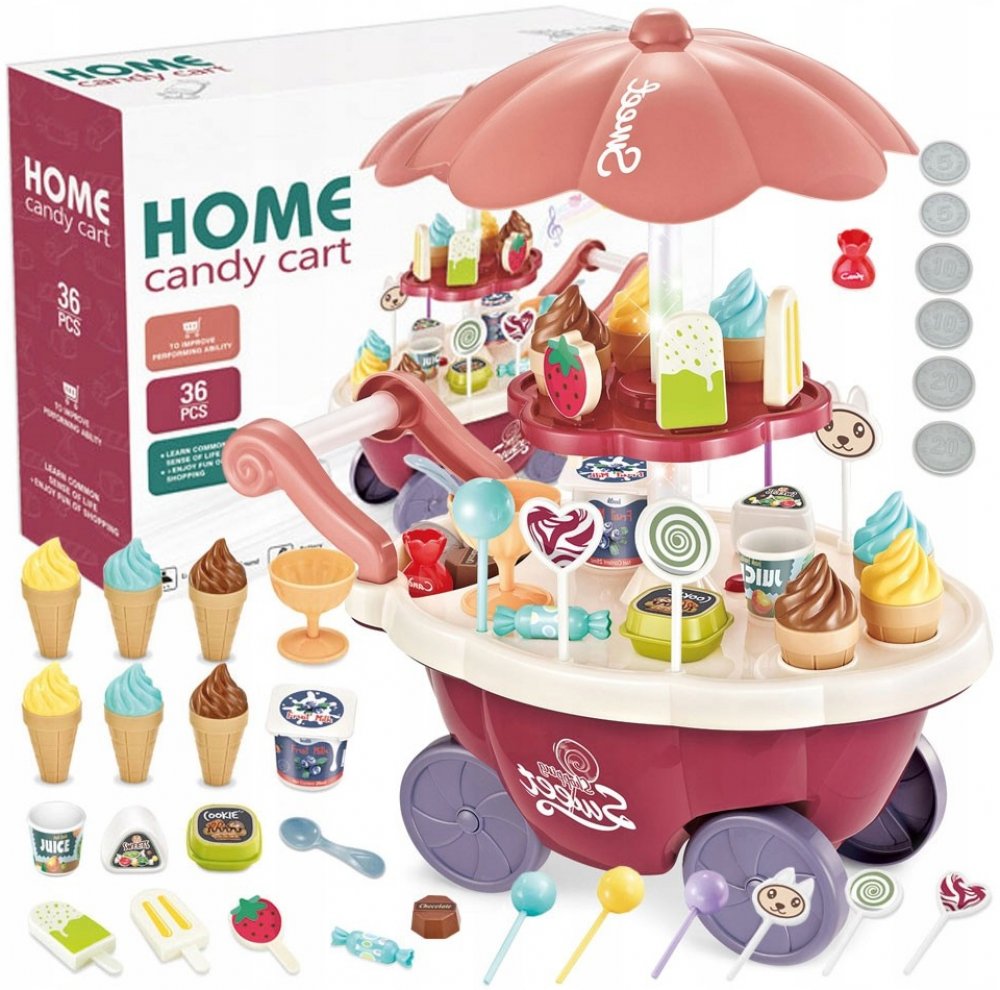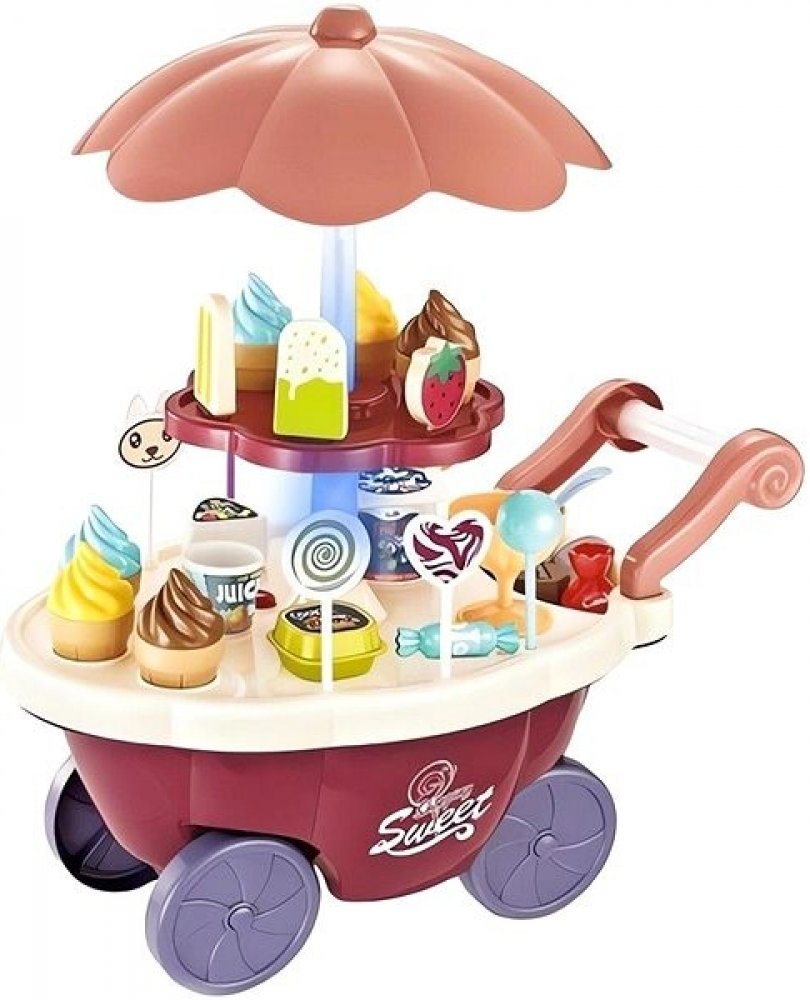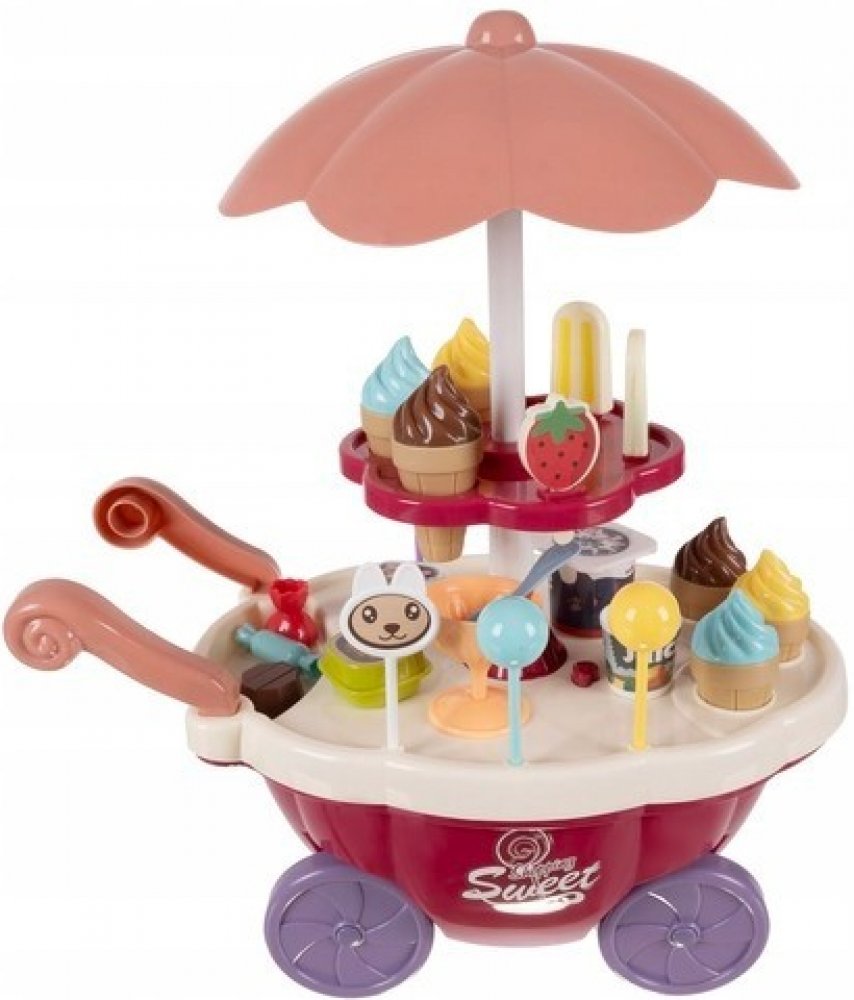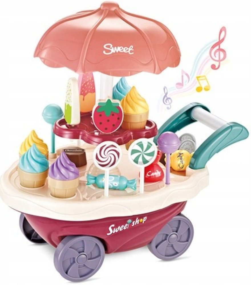 Zmrzlinový obchod v podobě hracího vozíku je perfektní hračka pro malé milovníky sladkostí. Tento kompaktní set imituje skutečný zmrzlinový stánek, kde děti mohou "prodávat" zmrzlinu, lízátka, bonbóny a další cukrovinky. Vozík nejenže přitahuje svou barevností, ale také vydává příjemné zvuky a svítí, což dětem poskytuje realistický zážitek z hraní.