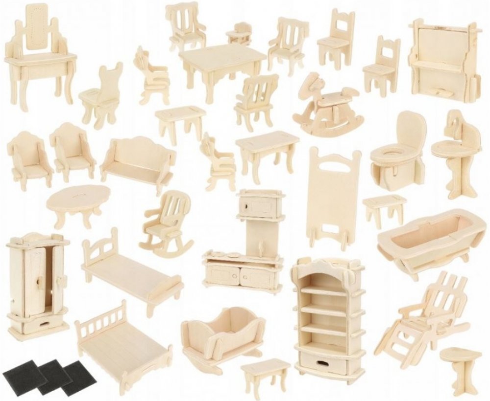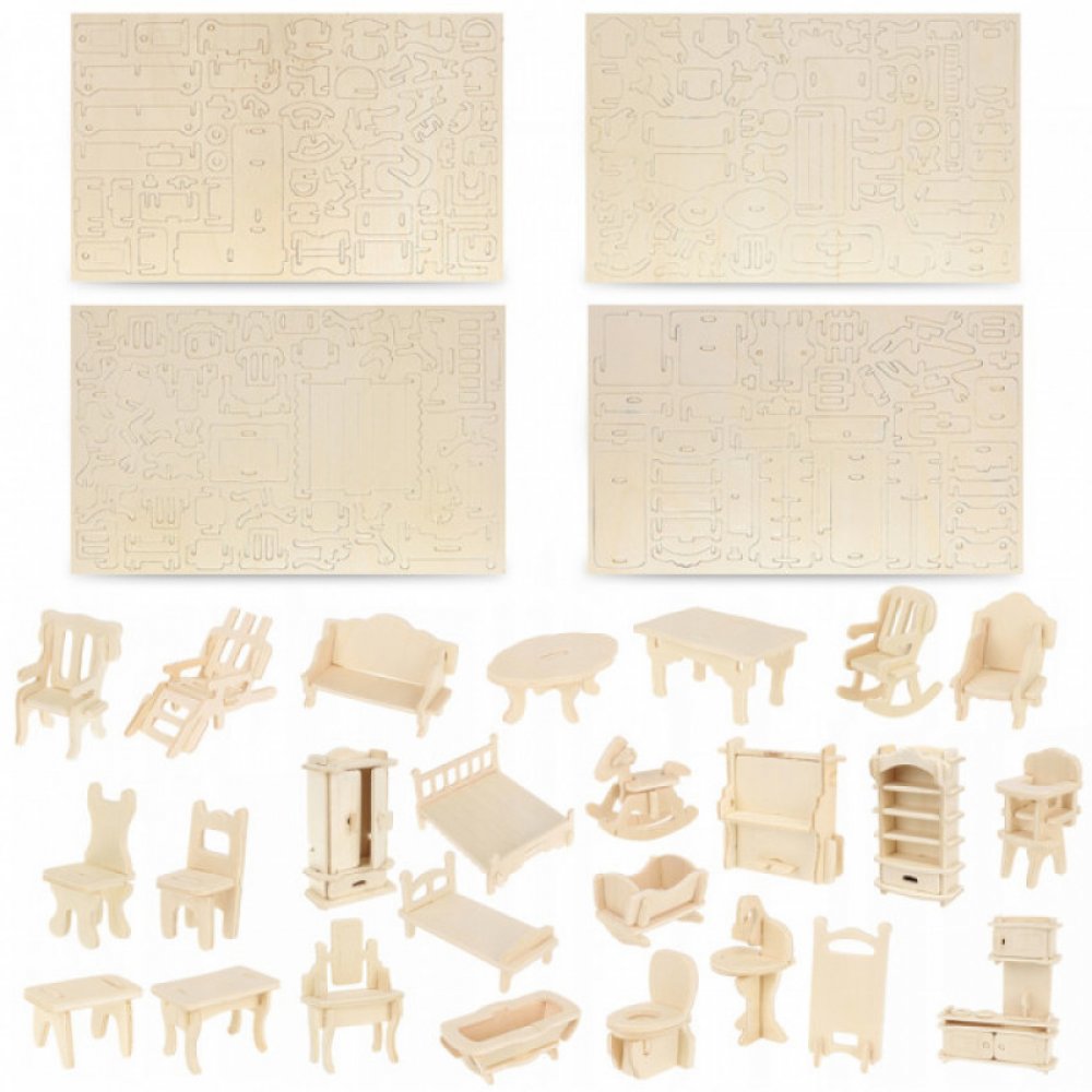 - Dřevěný nábytek pro panenky je dodáván ve formě 3D puzzle a skládání bude zábavou pro vás i vaše děti.