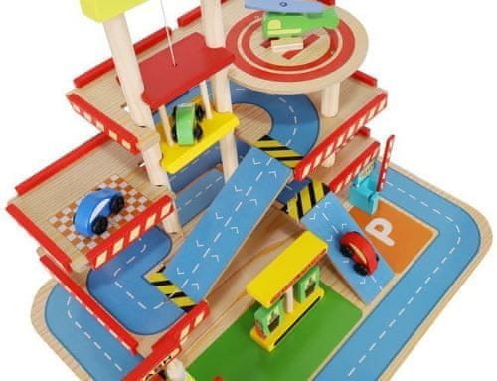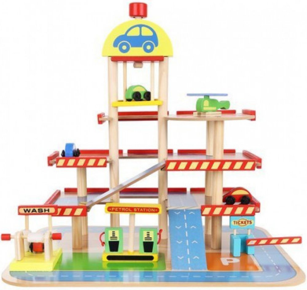 PARKOVÁNÍ – DŘEVĚNÁ GARÁŽ - sada se skládá z 27 dřevěných prvků (myčka, čerpací stanice, pokladna, 4 auta, vrtulník, 4patrová plošina, silnice a montážní sada), po složení získáme skvěle vypadající realistickou garáž – parkoviště, které potěší každé dítě. Hračka byla vyrobena ze dřeva a lakovaného nátěru, který je zdravotně nezávadný pro vaše dítě.