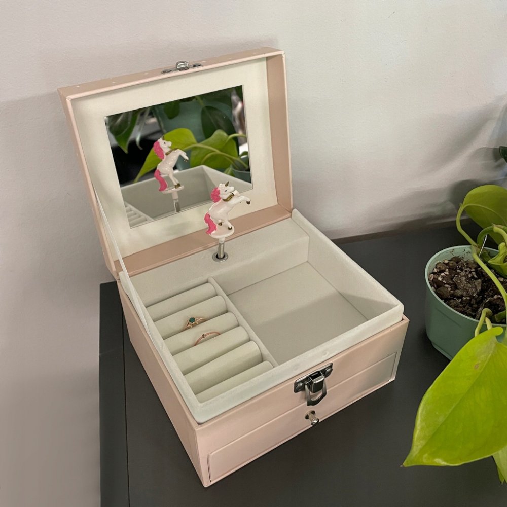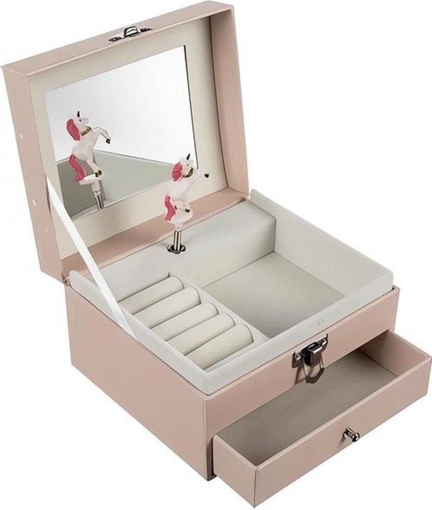 PROFILMOVÝ BOX Každá holčička má své poklady, které potřebují speciální úložný prostor. Tato půvabná krabička s hudební skříňkou bude ideálním místem pro všechny drobnosti. Krabička v pastelově růžové barvě je vyrobena z pevného kartonu, který zdobí motiv jednorožce a bílé hvězdičky. Uvnitř krabičky se nachází pět přihrádek na prstýnky a náušnice, schránka a zrcátko. Ve spodní části kufříku se nachází zásuvka, která poskytuje ještě více úložného prostoru pro vaše suvenýry.