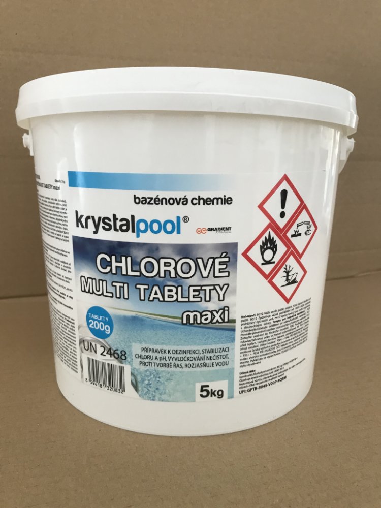CHLOROVÉ MULTI TABLETY maxi – multifunkční tablety 200 g pro údržbu bazénu. Slouží především k dezinfekci bazénové vody s baktericidní účinností a dále obsahují složky, které stabilizují hodnoty pH a tvrdosti bazénové vody, udržují hodnotu chloru, vyvločkování nečistot, zamezují tvorbě řas v bazénu a rozjasňují vodu. Jsou vhodné pro komplexní ošetření vody.