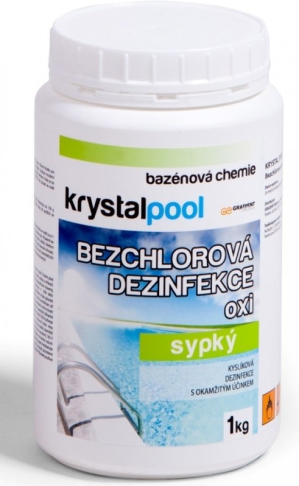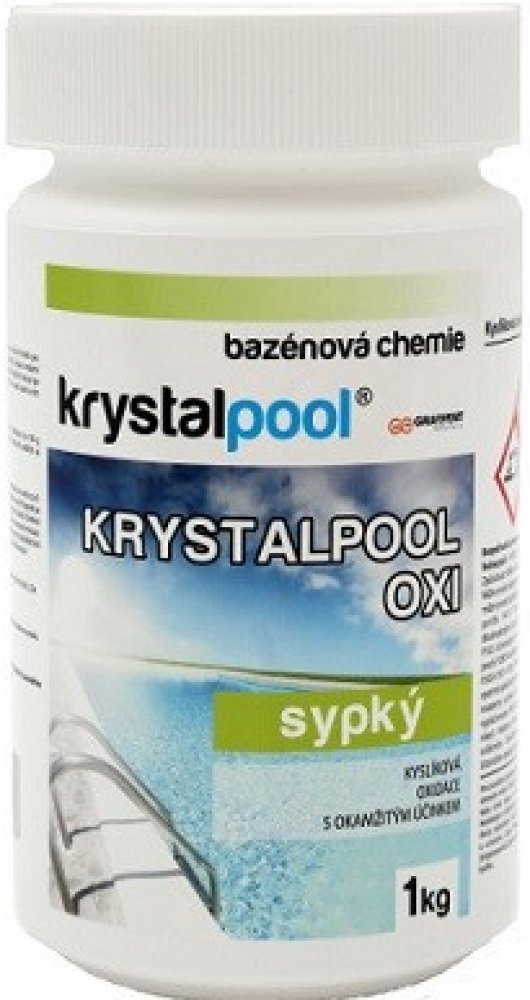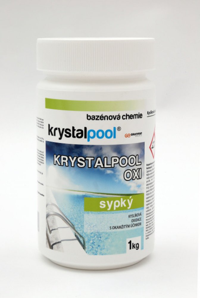 KRYSTALPOOL OXI je rychle rozpustný bílý prášek sloužící jako vysoce účinné činidlo pro bezchlórovou oxidaci vody v bazénech a vířivkách. Zvyšuje množství aktivního kyslíku ve vodě a zbavuje ji organických nečistot. Voda je po aplikaci čirá a jiskřivá. KRYSTALPOOL OXI působí ve vodě kysele a tím nepatrně snižuje hodnotu pH.