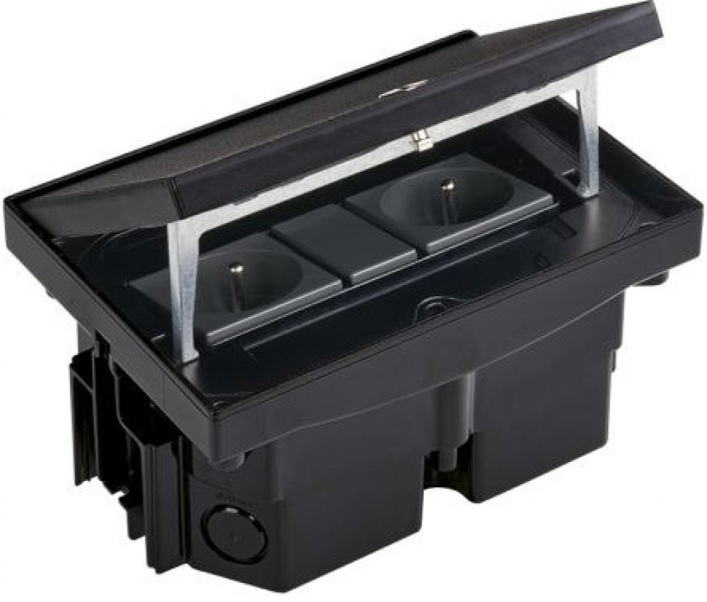 Bezpečný a praktický vývod kabeláže - výklopný kryt chrání připojené zástrčky a umožňuje bezpečný vývod i delších kabelů. V uzavřeném stavu je kryt zcela rovný. Při otevření je výška prostoru pro vývod kabeláže 84 mm.