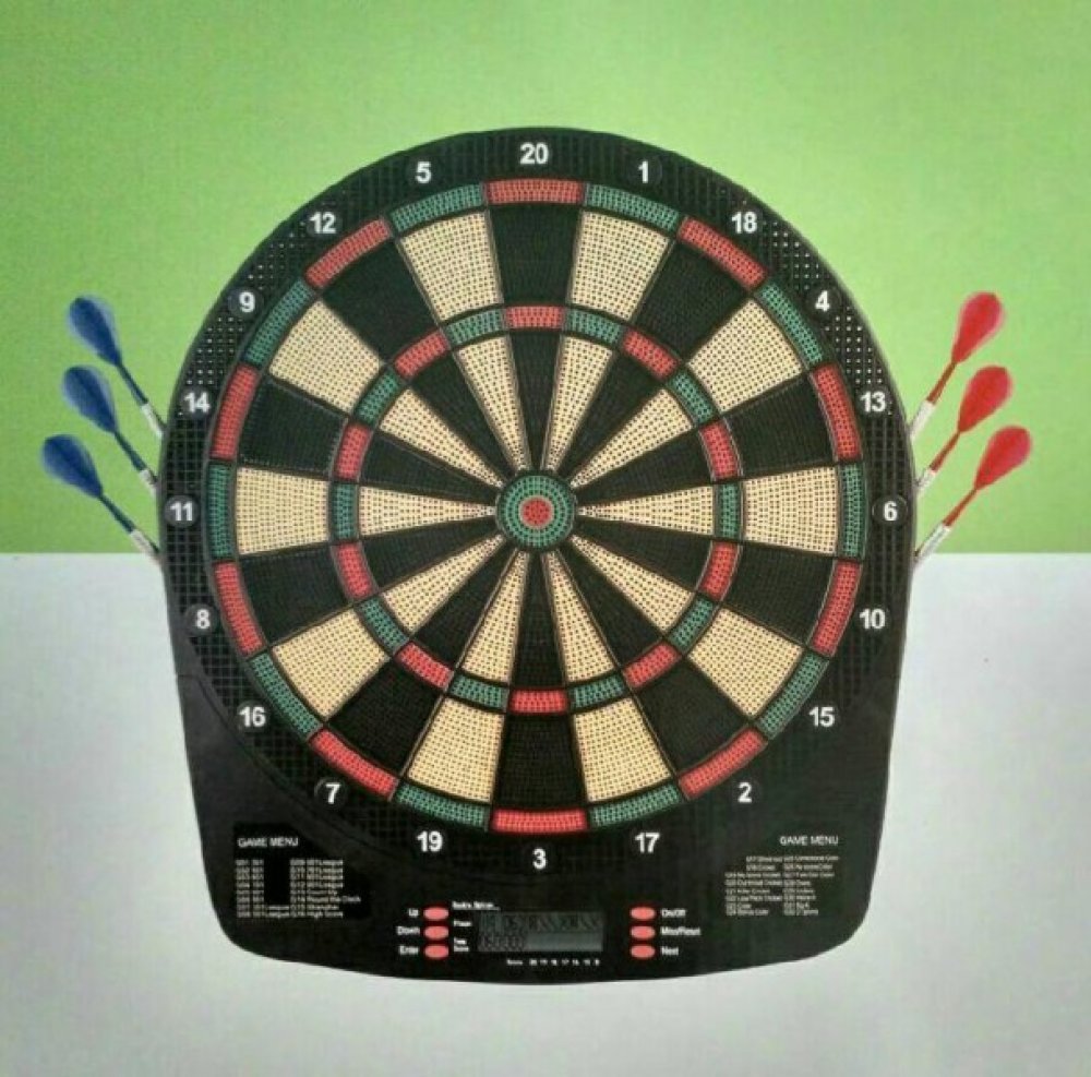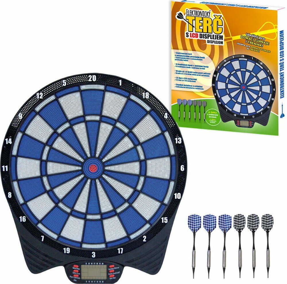 Mini terč se šipkami s dobře čitelným LCD displejem. Různé zvukové efekty, které lze ovládat tlačítkem zapnutí/vypnutí. K dispozici je celkem 18 hracích variant. Terč na šipky je navržen pro maximálně 8 hráčů. Napájení třemi bateriemi typu AA (nejsou součástí balení).