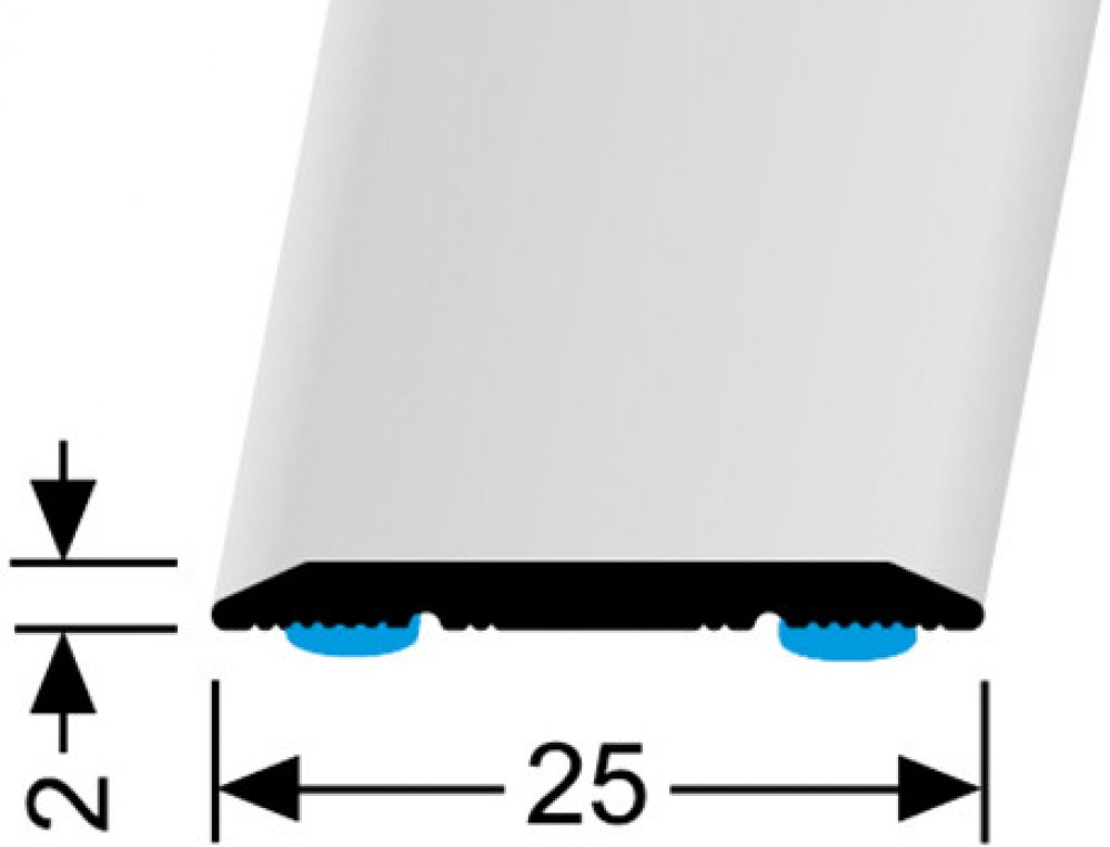 Přechodový profil plochý o šířce 25 mm s upevněním šrouby nebo samolepící. Je vhodný zejména pro přechod podlah o stejné výšce. Používá se k překrytí řezu po pokládce.