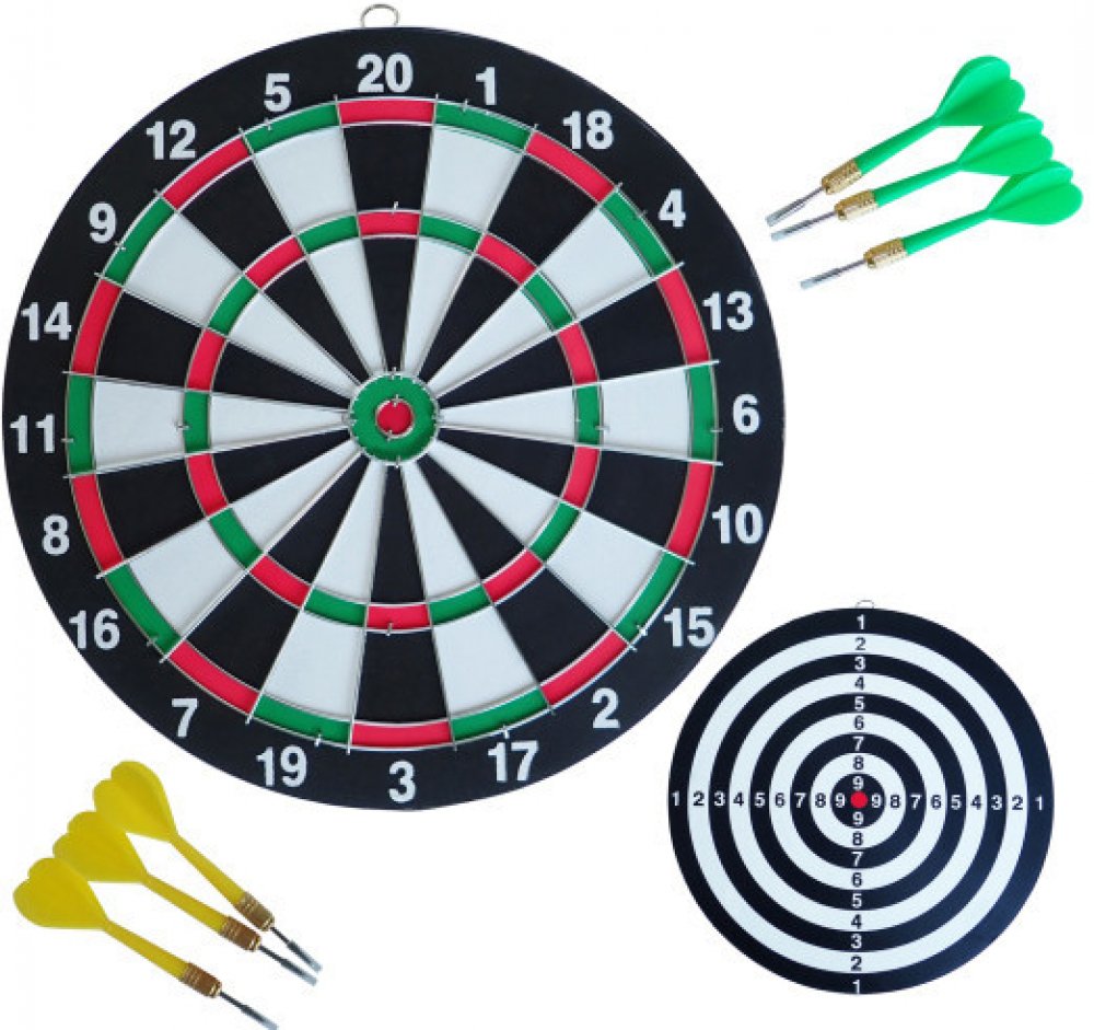 Terč + šipky - sada - terč s kovovým rámem o průměru 36,5 cm + 6 ks náhradních šipek s ostrými hroty. Baleno v blistru. Jedná se o odolný typ terče z vinutého papíru, který má dobrou trvanlivost. Kovový rám zpevňuje celou konstrukci terče.