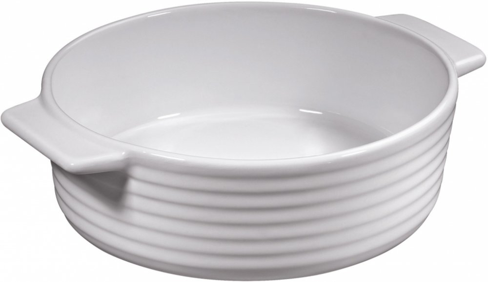 Porcelánová bílá menší kulatá zapékací mísa na gratinování, zapékání i servírování nákypu, lasagní, těstovin, gratinovaných brambory, masa, ryb i zeleniny od německé značky Küchenprofi. Rozměry s uchy: 19x16x5 cm. Rozměry bez úchytů: Ø 16 × 5 cm