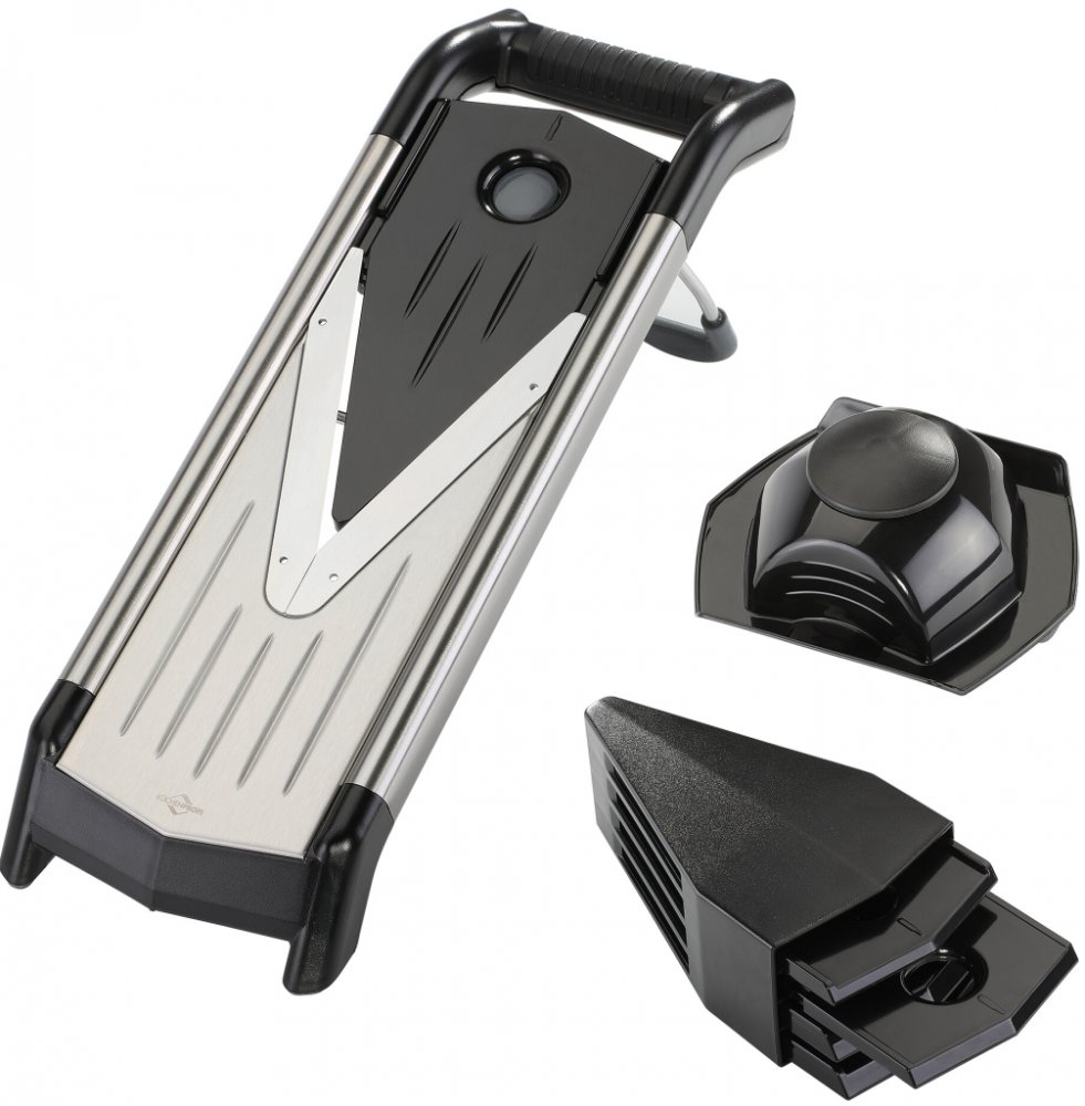 Profesionální kráječ zeleniny a ovoce s držákem potravin je velmi všestranný. Má pět krájecích nástavců s extra ostrými břity, které jsou vyrobené z nerezové oceli. Struhadlo řeže plátky i proužky od jemných po hrubé. Plátky okurek do salátu budete mít hotové během chvilky, mrkev a cuketa se rychle a snadno nastrouháte na jemné proužky julienne a jedlíci masa ocení tenké plátky carpaccia.
