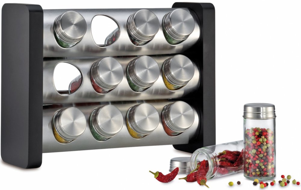 - Stojan obsahuje 12 kořenek ze skla s víčky, bez koření