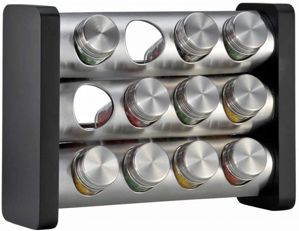 Hranatý stojan na kořenky vyrobený z nerez oceli v kombinaci se dřevem a sklem.