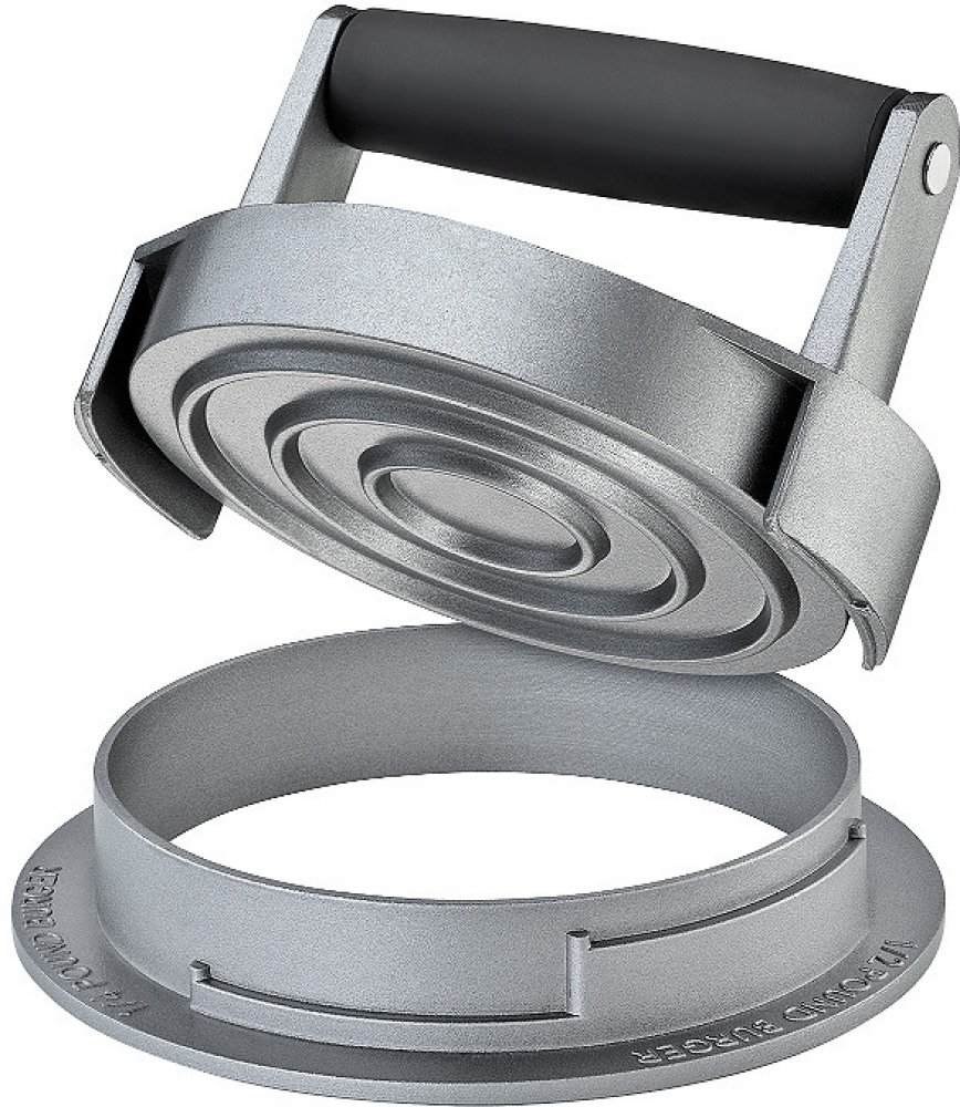 Hamburgerový lis TRIO z lakovaného hliníku na tři velikosti karbanátků. Podle toho, jaké označení na vnějším kroužku pressu zvolíte, dostanete karbanátek zhruba 125, 170 nebo 230 gramů. Spodní formu lehce naolejujte nebo vyložte papírem. Poté vložte mleté maso dovnitř a pevně na něj přitlačte horní část.
