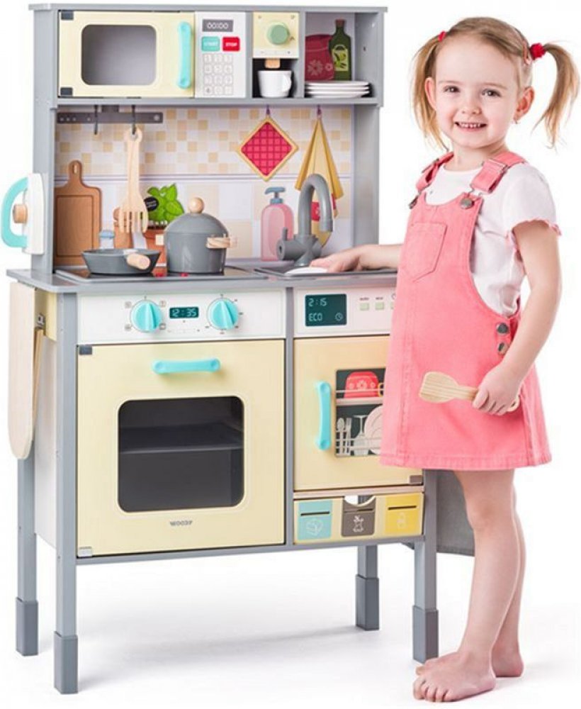 Děti si mohou hrát na vlastní domácnost či na vaření s pomocí této dřevěné hračky a připravit pro svou rodinu či kamarády dobroty vlastní výroby. Kuchyňská linka je se zvukovými a světelnými efekty. Po zapnutí se plotýnka rozsvítí červeným světlem a ozve se zvuk praskajícího oleje. Součástíje žehlící prkno a žehlička, kávovar, mikrovlnka, nádobí a nechybí ani pračka. Na zadní straně je tabule a součástí jsou i křídy. Najdete tady i mapu světa.