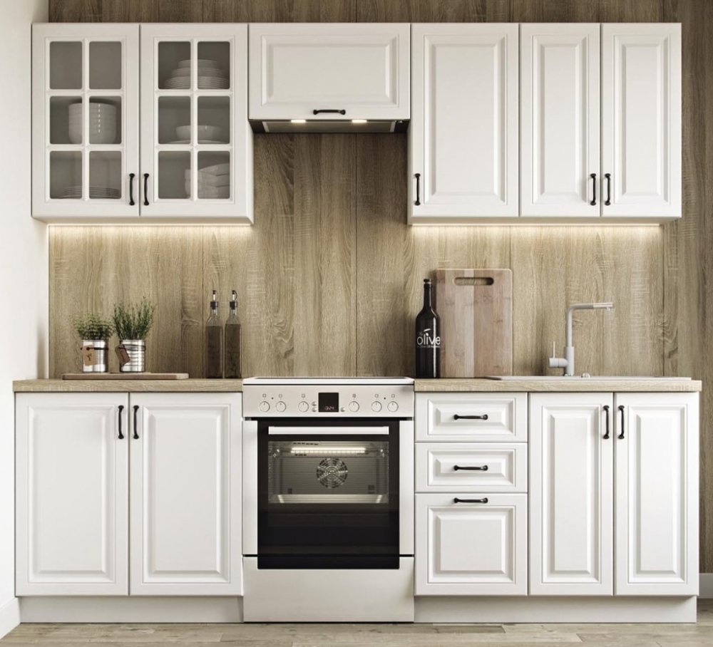 Kuchyně je dodávána v demontu. Součástí produktu jsou pouze skřínky a pracovní deska. Dřez, digestoř, trouba a další vyobrazené věci nejsou v ceně.