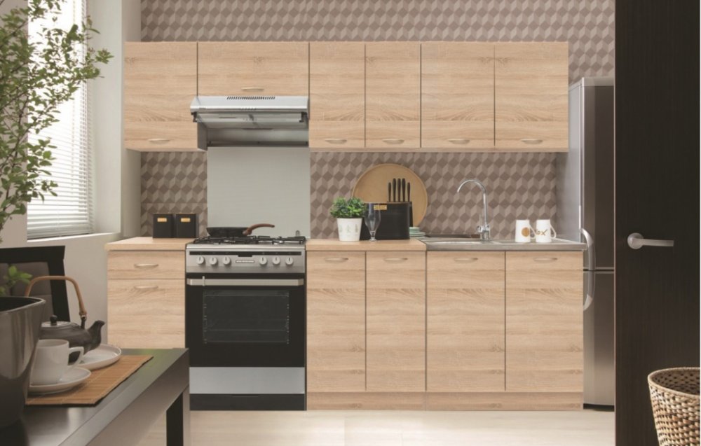 Kuchyně 180/240 cm Barva: - korpus: dub sonoma - dvířka: dub sonoma - pracovní deska: dub sonoma Materiál: LTD Rozměry: - délka: 180 cm (dolní řada)/240 cm (horní řada) - šířky dolních skříněk: - 1 x 80 cm - dřezová - 1 x 60 cm - dvířka - 1 x 40 cm - 1 zásuvka + dvířka - šířky horních skříněk: - 1 x 80 cm - dvířka - 1 x 60 cm - dvířka - 1 x 60 cm - nad digestoř - 1 x 40 cm - dvířka - hloubka skříněk: - dolní - 60 cm s pracovní deskou, 45 cm užitná hloubka - horní - 30 cm, 28,5 cm užitná hloubka - pracovní deska: dělená - 1 x 40 cm + 1 x 60 cm, hloubka 60 cm - výška dolních skříněk: 85 cm (s pracovní deskou i soklem) - výška horních skříněk: 57,3 cm Na skříňku pod dřez se pracovní deska nedodává! Vychází se z toho, že si tam umístíte celoplošný dřez 80x60 cm. Dřez, spotřebiče a dekorace nejsou v ceně. Dodáváno v demontu. Záruka 24 měsíců.