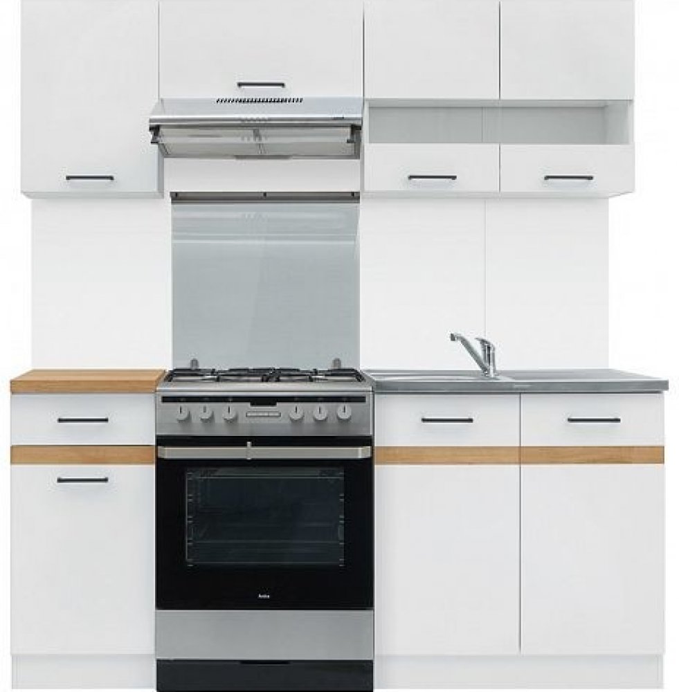 Kuchyně 120/180 cm Barva: - korpus: bílý - dvířka horních skříněk: bílý lesk - dvířka dolních skříněk: bílý lesk s ozdobnou lištou dub burlington - pracovní deska: dub craft zlatý Materiál: LTD tloušťka 15 mm, závěsy Hettich, válečkové kolejničky, plastové rukojeti Siro Rozměry: - délka: 120 cm (dolní řada)/180 cm (horní řada) - šířky dolních skříněk: - 1 x 80 cm - dřezová DK2D (bez dřezu a pracovní desky) - 1 x 40 cm - 1 zásuvka + dvířka D1D1S - šířky horních skříněk: - 1 x 80 cm - dvířka - prosklená G2W - 1 x 60 cm - nad digestoř GO - 1 x 40 cm - dvířka G1D - výška skříněk: - dolní - 82 cm (bez pracovní desky) a 85,2 cm (s pracovní deskou) - horní - 57,5 cm - hloubka skříněk: - dolní - 47 cm - horní - 30,5 cm - pracovní deska: 1 x 40 cm, hloubka 60 cm, tloušťka 32 mm Na skříňku pod dřez se pracovní deska nedodává! Vychází se z toho, že si tam umístíte celoplošný dřez 80x60 cm. Dřez, spotřebiče a dekorace nejsou v ceně. Dodáváno v demontu. Záruka 24 měsíců.