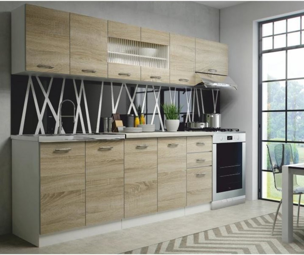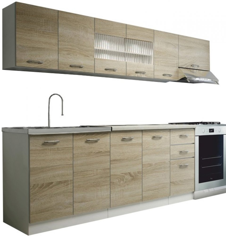 Základní kuchyňská sestava PROMO. Korpus kuchyně je v bílé barvě. Materiál: DTD laminovaná Darebné provedení: dub sonoma/bílá Tloušťka materiálu: 16 mm Horní rozměr is digestořovou skříňkou je 260 cm, dolní rozměr je 200 cm. Možnost dokoupit univerzální dřez v ceně 69 Eur z naší nabídky. Dřezová skříňka je dodávána bez pracovní desky.