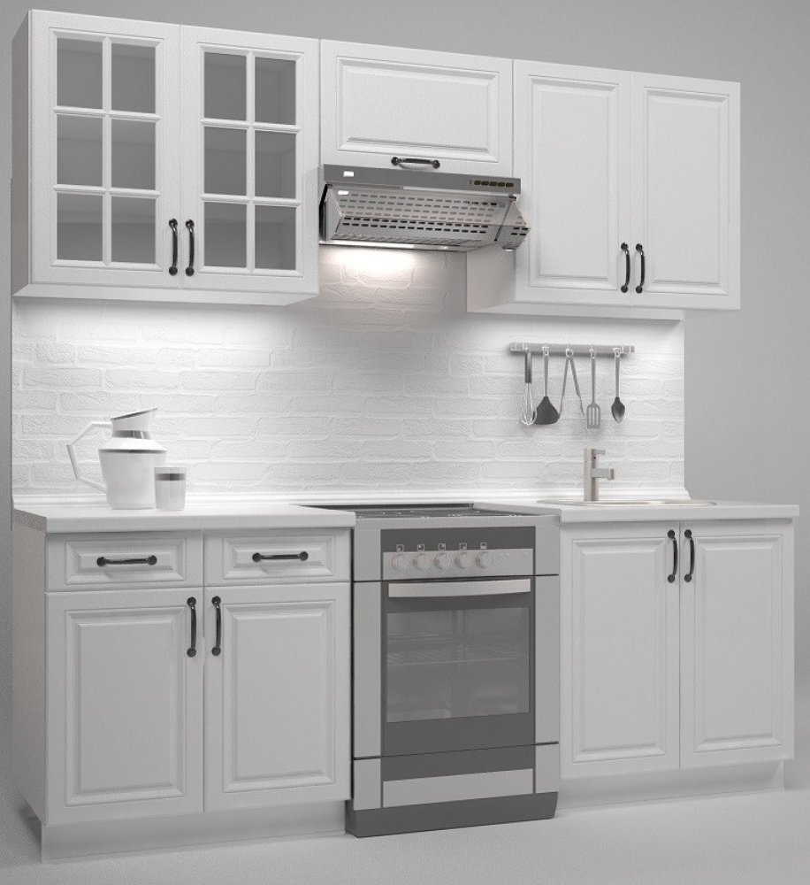 Kuchyňská linka MONA ve vintage stylu 220 cm - bílá Nádherná bloková kuchyňská linka v rustikálním stylu se stane dominantou kuchyně. Detailní a kvalitní zpracování se vzhledem, který se zkrátka neomrzí, z ní činí ideální linku do venkovsky designovaných domácností. Nenechte se ale zmást vzhledem. Je použito moderní kovové kování a pístové výklopné otevírání skříňky nad odsávačem par, které zaruču...