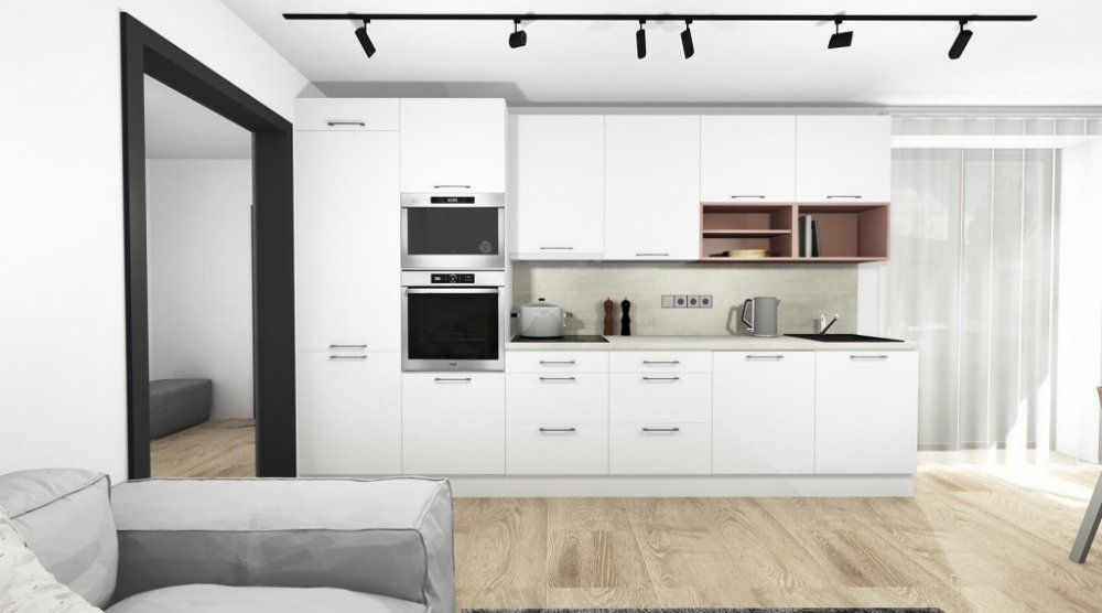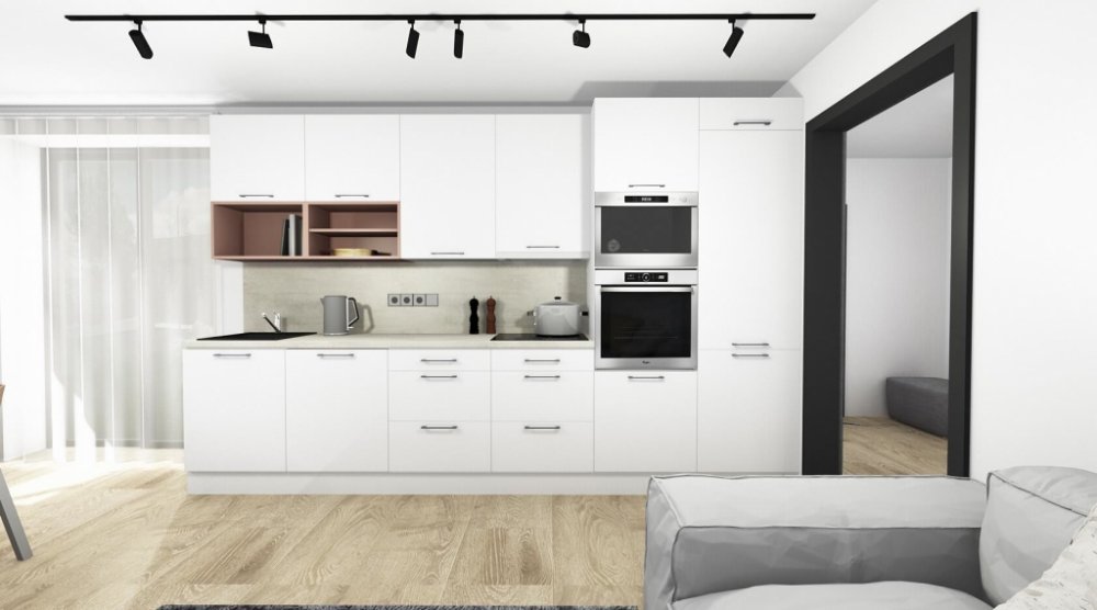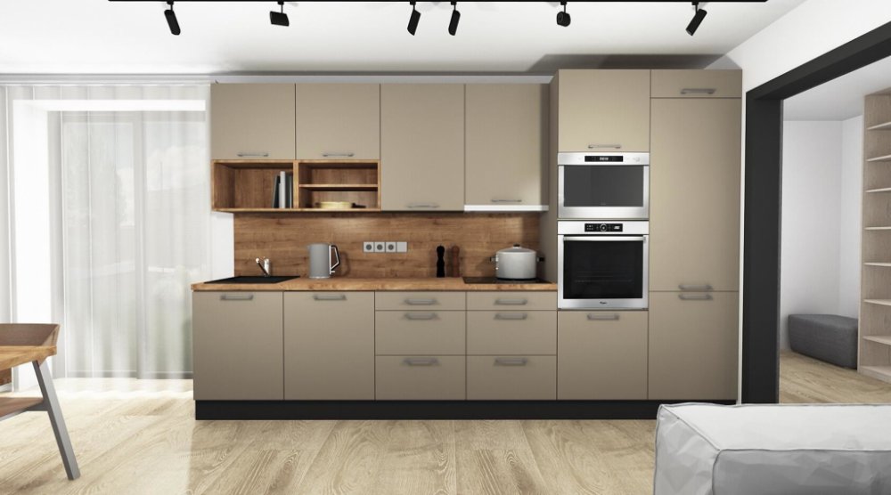 I na menším prostoru je zachována správná ergonomie. V kuchyni POMELO 240 pohodlně připravíte pokrmy na pracovní ploše 120 cm. Jednotlivé funkční zóny na sebe plynule navazují. Pro usnadnění vaší práce je možné doplnit mycí centrum o vestavěnou myčku nádobí, či do tohoto prostoru zabudovat podstavnou lednici. V kuchyni jsou praktické úložné prostory, včetně výsuvné skříňky pod dřezem, vhodné k umístění sorteru na kuchyňský odpad. Otevřená nika poslouží pro ukládání věcí a zanechá vzdušný vzhled vaší kuchyni.
