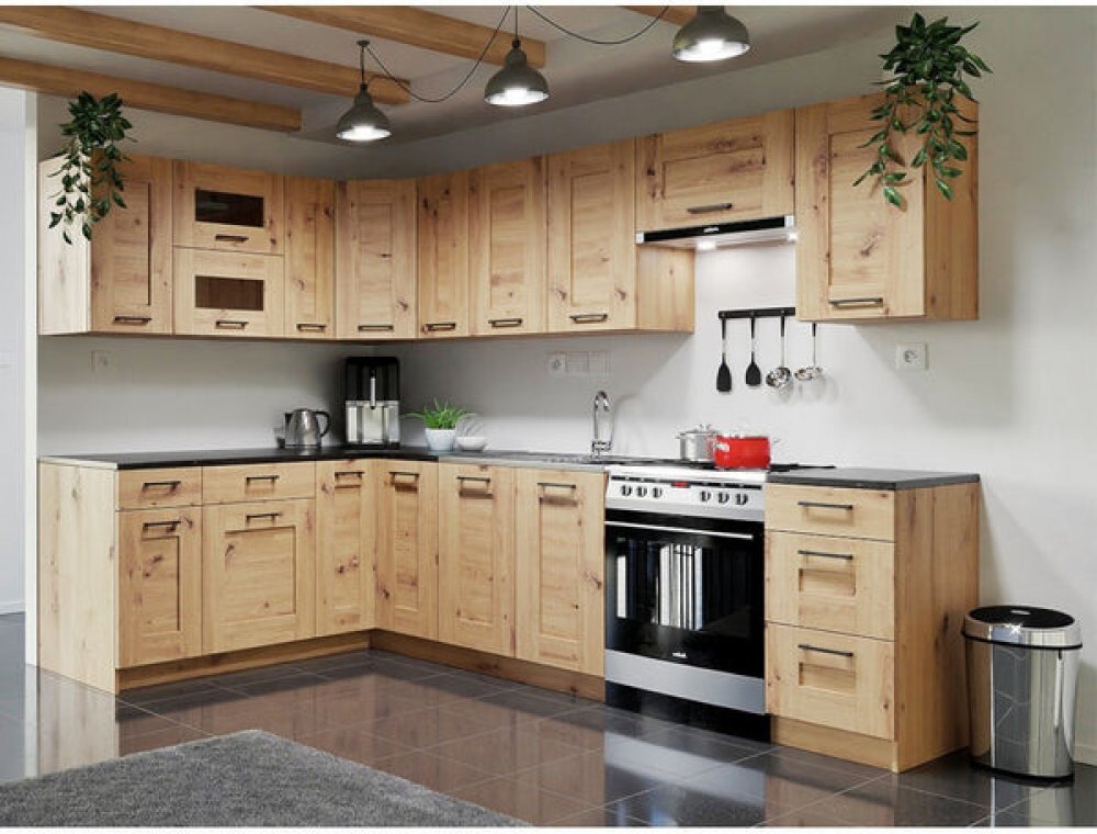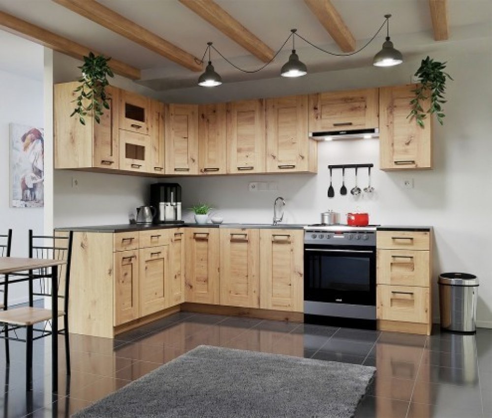 Moderní kuchyně Jorica Kuchyně Jorica vás zaujme hned v několika směrech. Oceníte její rozsáhlý a prakticky členěný úložný prostor a moderní design. Je provedena v rozměrech 270x190 cm a tvoří ji 8 horních a 5 dolních skříněk. Společně tyto části vytvářejí objemný úložný prostor, který bohatě vystačí pro uskladnění všech potřebných věcí. Celá kuchyně je postavena na výškově regulovatelných nožkách, kterými snadno vyrovnáte případné nerovnosti a poté je ukryjete za spodní krycí lištu (sokl). Horní část kuchyňské sestavy je tvořena z 8 skříněk. Spodní část se skládá z 5 skříněk s výškově nastavitelnými nožkami, přičemž jedna ze skříněk počítá se s umístěním samostatně stojícího sporáku. Zásuvky v dolních skříňkách je možné zatížit až 15 kg. Pracovní deska se skládá ze tří částí, přitom není na dřezové skříňce. Kuchyně Jorica je vyrobena z laminovaných dřevotřískových desek (LDTD) přírodním dekoru dubu artisan. Pracovní deska je v dekoru černého mramoru. Tento materiál vyniká v oblasti odolnosti proti oděru, poškrábání i krátkodobé vlhkosti a jsou nenáročné na údržbu a čištění - k odstranění drobných nečistot postačí běžný saponát a vlhčený hadřík. Videorecenze ke kompletnímu řešení pro vaši kuchyni Videorecenze ke kuchyni Jorica je ilustračního charakteru. Zobrazuje vybrané kompletní řešení kuchyně včetně elektrospotřebičů. Kompletní řešení pro vaši kuchyni Víme, jak ušetřit váš čas. Proto u nás najdete kuchyni Jorica spolu s elektrospotřebiči tak, aby byl její nákup ještě snazší. kompletní řešení pro vaši kuchyni Rozměry kuchyně Jorica Výhody: moderní vzhled, přírodní dekor objemný a prakticky členěný úložný prostor kvalitní a odolné materiály atraktivní dekor dřeva Složení sestavy: 8x horní skříňka 5x dolní skříňka pracovní deska složená ze tří částí (130+90+40 cm) sokl čelní (170+143 cm) sokl boční 2x45,4+40 cm Provedení: materiál: LDTD dekor ploch: dub artisan dekor pracovní desky: černý mramor povrchová úprava: mat pracovní deska: 130x60 cm, 90x60 cm, 40x60 cm, tloušťka: 28 mm výškově regulovatelné nožky rozměry: 270x190 cm prostorová orientace: levý roh Rozměry jednotlivých částí: horní skříňka U80: 80x72x32 cm horní výklopná prosklená skříňka UG60: 60x72x32 cm horní digestořová skříňka U60V: 60x36x32 cm 2x horní skříňka U40: 40x72x32 cm 2x skříňka U30: 30x72x32 cm horní rohová skříňka UN60: 60x72x60 cm dolní dřezová skříňka D80: 80x85x52 cm, bez PD, doporučujeme dokoupit celoplošný dřez dolní skříňka s 1 zásuvkou DS1 60: 60x85x52 cm dolní skříňka s 1 zásuvkou DS1 40: 40x85x52 cm dolní rohová skříňka: 90x85x90 cm dolní skříňka se 3 zásuvkami DS3 40: 40x85x52 cm Dodání: demontováno 17 samostatných balíků