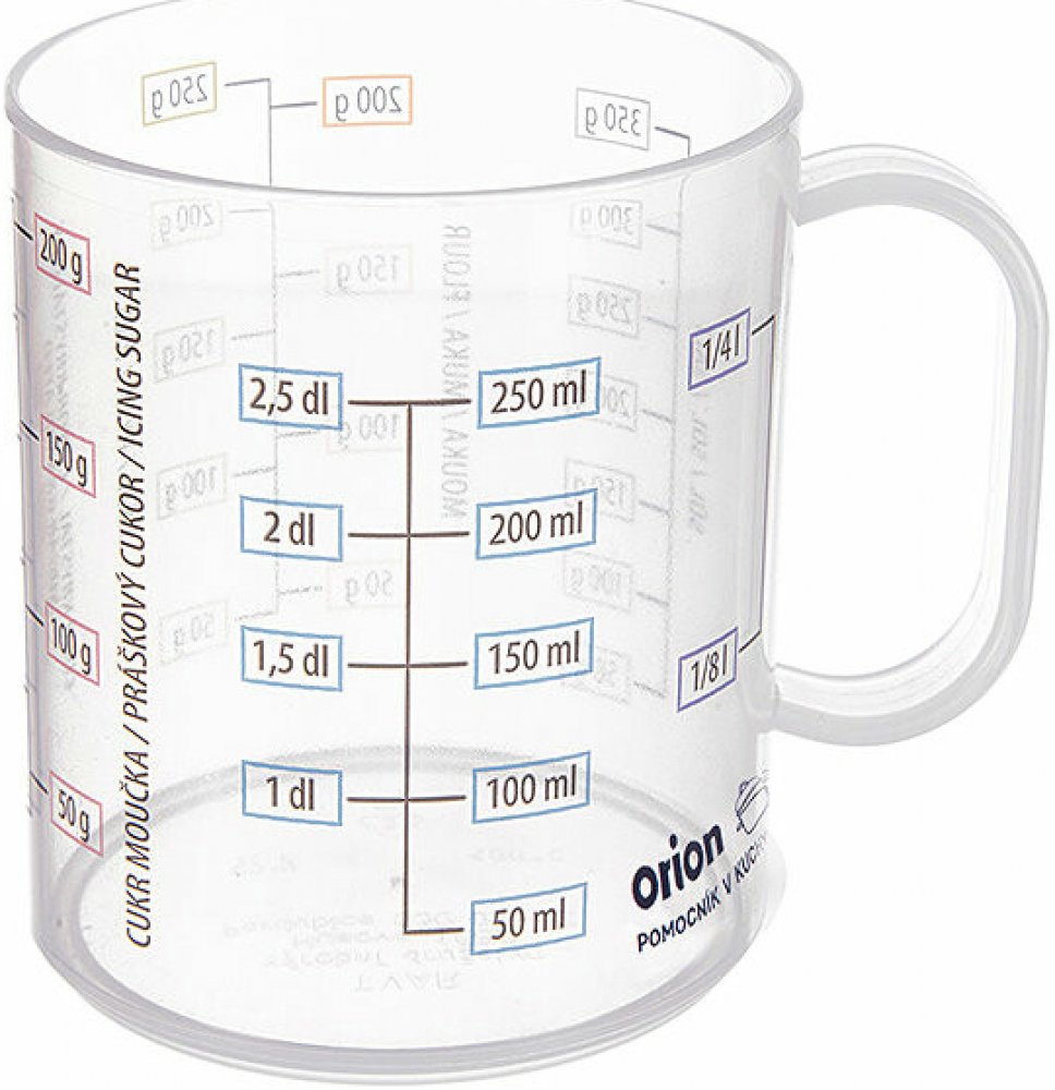 Klíčové přednosti produktu ORION Odměrka s potiskem 0,25 l UH Kuchyňská odměrka ORION je nezbytná pro dodržení receptů Správné dávkování všech přísad je zásadní pro vyváženou chuť i konzistenci pokrmů Odměrku můžete bez problémů mýt v myčce, což vám ulehčí práci Je vyrobena z plastu Kuchyňská odměrka má kapacitu až 250 ml Značení je uvedeno v jednotkách: ml Přidané ucho poslouží ke snadnější manipulaci Průhledné provedení Kuchyňská odměrka ORION měří 8,7 × 7,5 × 7,5 cm (vך×h)