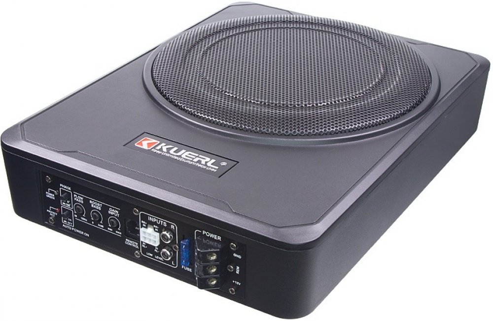 Aktivní subwooferový box se zesilovačem a reproduktorem o průměru 250 mm vhodný pro instalaci např. pod sedadlo.