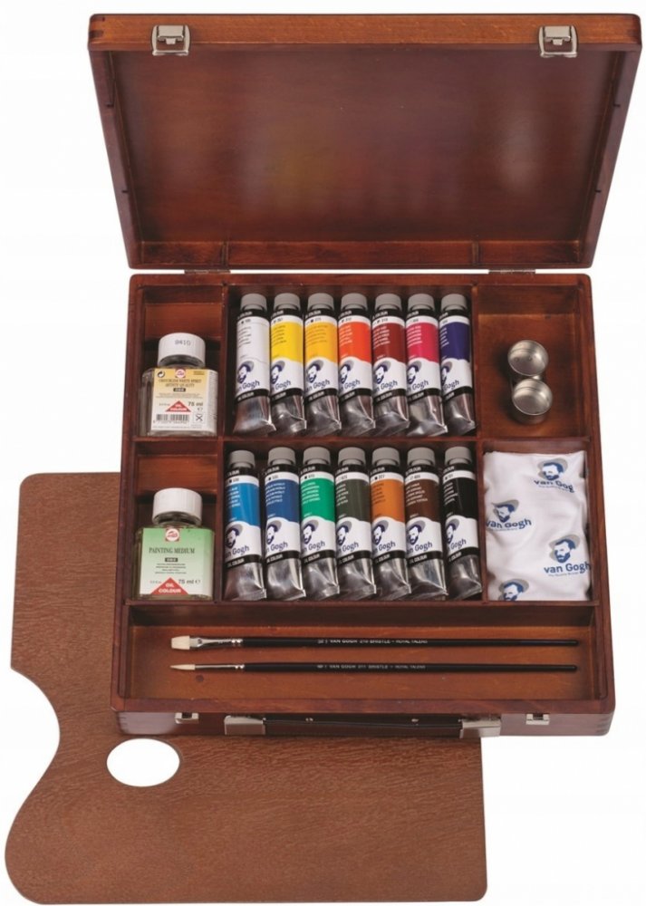 Sada olejových barev Van Gogh - INSPIRATION BOX - profesionální značky Roy al TALENS obsahuje : 14x olejová barva Van Gogh 40ml 1x bezzápachové ředidlo 1x malířské médium 1x štětec č.10 ( model Gussow - prasečí chlupy ) 1x kulatý štětec č.6 - prasečí chlupy 1x paletový nůž č. . 3014 1x nádobka na míchání barev dvojitá 1x dřevěná paleta 1x čistící utěrka 1x brožura o mieašaní barev 1x dřevěné pouzd...