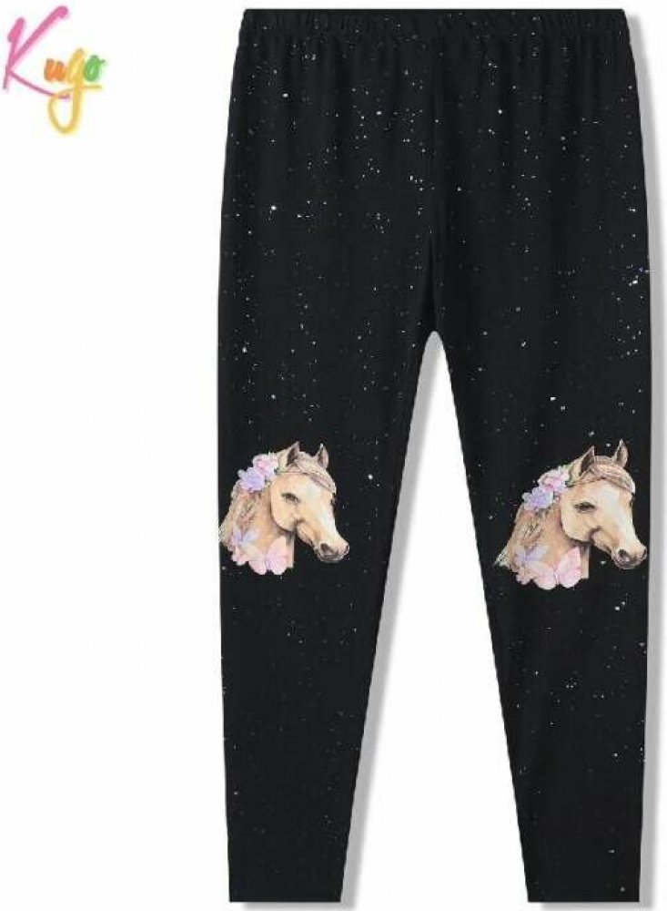 Elegantní dívčí legíny v černé barvě zdobí jemný třpytivý potisk, který působí kouzelně a slavnostně. Na nohavicích jsou nádherně vyobrazeni koně s květinovou ozdobou, což si zamiluje každá malá milovnice zvířat. Díky složení 95 % bavlna a 5 % elastan jsou legíny pohodlné, příjemné na těle a krásně pružné. Skvělá volba na běžné nošení i speciální příležitosti.