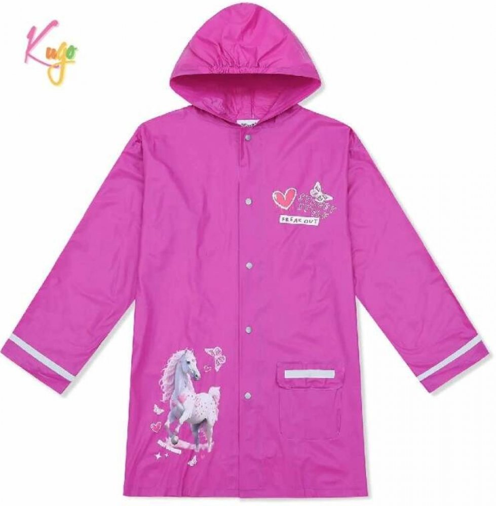Stylová fialová pláštěnka pro holky značky Kugo zaujme potiskem koně s nápisem „BEST BUNNIES“ na přední i zadní straně. Horní část zdobí nápisy „FREAK OUT“, srdíčko a motýlek. Vyrobena z odolného materiálu, který poskytuje spolehlivou ochranu před deštěm. Pláštěnka má kapuci, zapínání na druky a jednu přední kapsu. Reflexní prvky na rukávech zajišťují lepší viditelnost za šera.