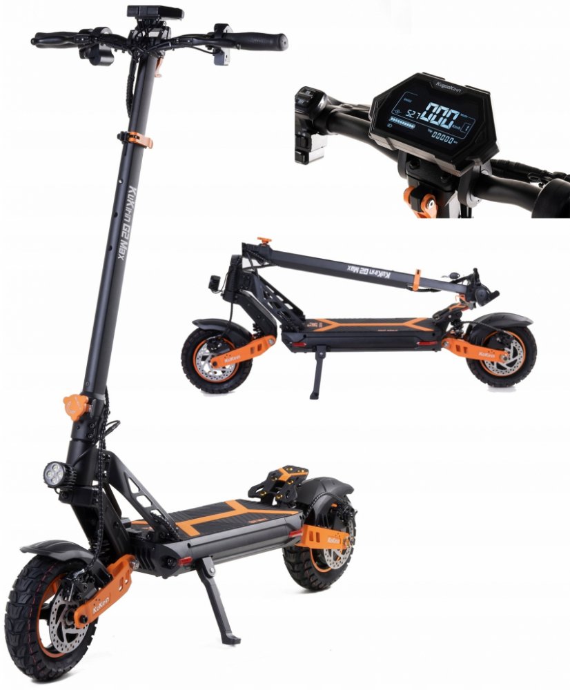 Kugoo Kirin G2 Max je elektrická koloběžka s výkonem 1000W, která má dojezd až 80 km a maximální rychlost 25km/h (možnost odblokovat na 55 km/h). Je vybavena 10 palcovými pneumatikami s kvalitním odpružením a má tři jízdní režimy (Eko, Normal, Turbo). Její hmotnost je 31 kg a maximální výkon dosahuje 1200W. Baterie má kapacitu 48V 20AH a nosnos...
