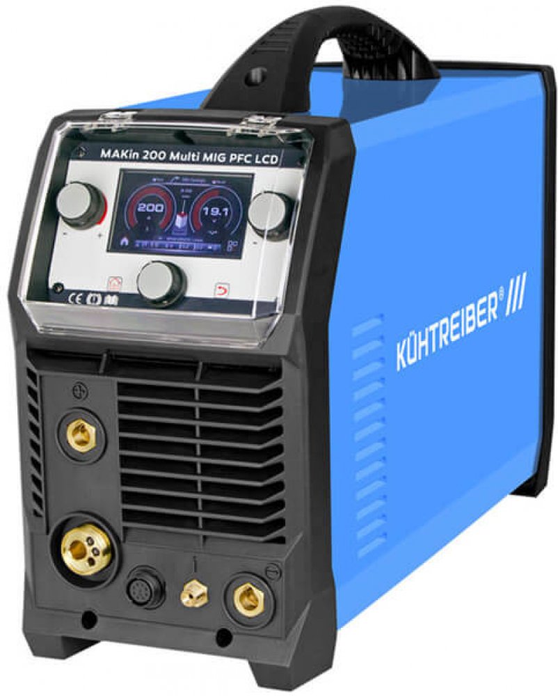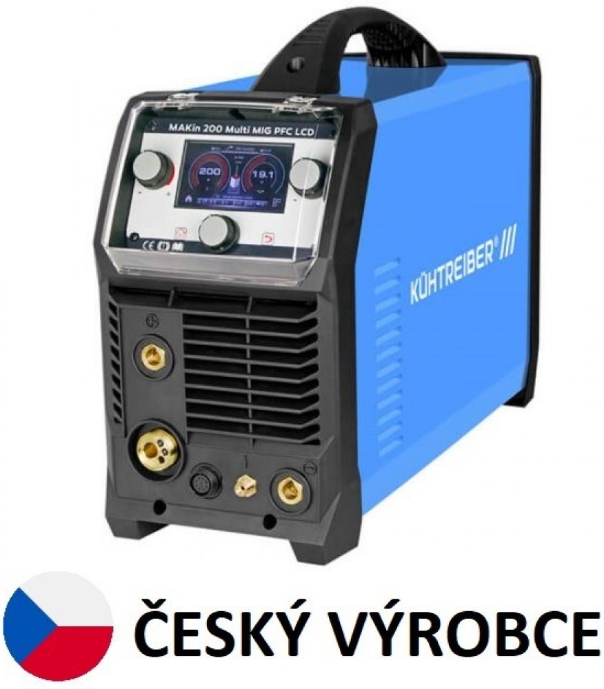 MAKin 200 Multi MIG PFC LCD je profesionální invertorový svařovací stroj určen pro svařování metodami MIG/MAG, MMA (obalenou elektrodou) a TIG s dotykovým startem (svařování v ochranné atmosféře netavící se elektrodou). Jedná se o zdroj svařovacího proudu se strmou a plochou charakteristikou. Svařovací stroj je zkonstruován s využitím vysokofrekvenčního transformátoru s feritovým jádrem, transistory, digitálním řízením a SMD technologií. Komfortní ovládání díky velkému přehlednému grafickému displeji. Stroj je vybaven synergickým programem pro ocelové, hliníkové, nerezové a CuSi materiály. Synergický program zajišťuje uživateli jednoduché a intuitivní ovládání stroje. Uživatel nastaví průměr drátu, druh plynu, svařovaný materiál a stroj zajistí nastavení ostatních parametrů pro získání perfektních svařovacích vlastností. Technologie PFC (Power Factor Correction) zajišťuje stabilní svařovací proces při kolísavém napětí v elektrické síti, při použití dlouhých prodlužovacích kabelů bez jakéhokoliv rozdílu na svařovacím oblouku. Vyniká vysokou účinností a splňuje nejpřísnější normy EU týkající se ekodesignu svařovacích strojů. Mezi jeho přednosti patří stabilní oblouk, energeticky úsporný provoz a jednoduchá obsluha - manuální ovládání pro nastavení svařovacích parametrů. Stroj je určen pro použití drátu o průměru 0,6/0,8/0,9/1,0 mm. VLASTNOSTI A VYBAVENÍ grafický displej JOB MODE pro nastavení a uložení až 10 vlastních svařovacích programů perfektní stabilita oblouku připojení dálkového ovládání pro regulaci svařovacího proudu tepelná ochrana se světelnou signalizací Metoda MMA HOT START umožňuje snadnější zapálení obalované elektrody ANTI STICK umožňuje snadné odlepení elektrody v případě přilepení ARC FORCE zajišťuje stabilitu oblouku SOFT START MMA (zabraňuje vypadávání jističů) generátor Metoda MIG/MAG 2-takt / 4-takt předfuk / dofuk plynu SOFT START dohoření drátu indukčnost dálkové ovládání UP/DOWN nebo potenciometr generátor Metoda TIG DC 2-takt / 4-takt předfuk plynu generátor DOWN SLOPE dálkové ovládání UP/DOWN nebo potenciometr