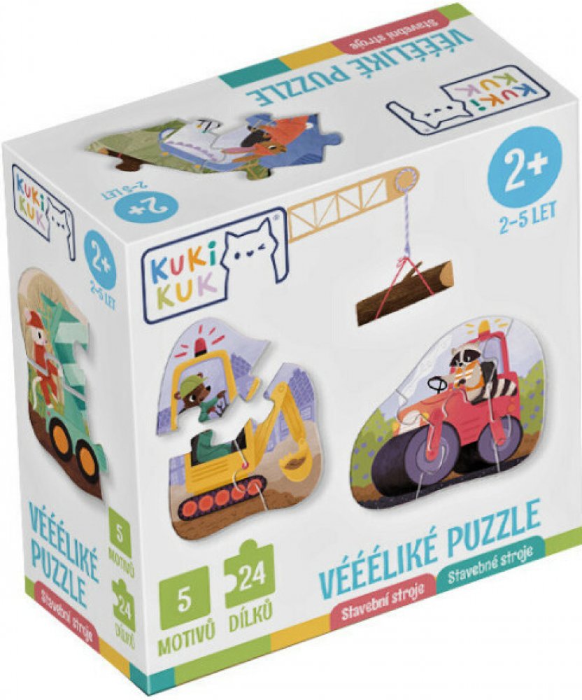 Obsahuje 5 různých stavebních strojů – od dvoudílného až po velké sedmidílné puzzle.