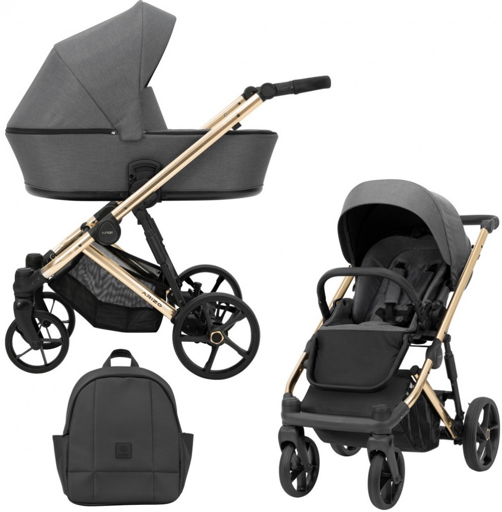 Nezapomenutelné procházky s kočárkem Kunert Arizo Premium: 2 v 1. Lehká a designová s funkcemi, díky kterým bude každá procházka jedinečná. Výběrem našeho kočárku se postaráme o pohodlí vašeho dítěte i vaše. Přijďte se podívat, kolik výhod získáte výběrem Arizo!Objevte nejdůležitější vlastnosti kočárku Arizo:Lehký design, pohodlí a stylKočárek Arizo je nejen lehký, ale také vybavený komfortem pro miminko. Jen věnujte pozornost:*Trojrozměrný design rámu ve zlaté nebo černé barvě, který dodává kočárku jedinečný, moderní vzhled.*Karbonová rukojeť, která zajišťuje odolnost a eleganci.*Stylová, pohodlná kolečka a elegantní batoh, díky kterým budou vaše procházky nezapomenutelné.Gondola – pohodlí a bezpečí za každého počasíBezpečné procházky s Kunert Arizo Premium jsou možné díky gondole, která:*Zajišťuje optimální proudění vzduchu** díky zipu a ventilačnímu panelu.*Chrání dítě před UV zářením** díky sluneční cloně UV50.*Zaručuje klidný spánek a bezpečí** díky měkké matraci a bokům pokrytým měkkým materiálem.Kočárek - pohodlí, bezpečnost a přizpůsobení se počasíKočárek Arizo je:*Nastavení opěradla ve čtyřech polohách zajišťující dostatečné pohodlí.*Nastavení opěrky nohou a přídavná matrace zvyšující pohodlí dítěte.*Lze nainstalovat po směru nebo proti směru jízdy a bezpečnostní pásy a zábrana chrání dítě.Navrženo pro každé roční obdobíProcházka s kočárkem Arizo Premium bude úspěšná bez ohledu na počasí díky:*Větrací okénko zajišťující proudění vzduchu uvnitř kočárku.*Návlek na nohy, který vás zahřeje v chladnějších dnech.*Nezávisle na intenzitě slunečního záření provoz sluneční clony.Skládání a rozkládání – intuitivní a rychléPříprava kočárku na cestování nebo jeho složení je rychlé a intuitivní díky:*Systém skládání a rozkládání jednou rukou.*Rychlý plochý skládací systém pro gondolu.*Lehký a odolný rám s odpružením zadních a bočních kol.Pohodlí pro rodičeKočárek Arizo Premium je pohodlný i pro rodiče díky:*Bezpečnostní popruh na rukojeti.*Nastavitelné rukojeti a protiskluzový povrch.Praktické doplňkyKočárek Arizo Premium dále nabízí:*Velký a módní batoh.*Držák na láhev.*Nepromokavá fólie a moskytiéra.Technická data:-Rozměry složeného rámu (délka x šířka x výška) - 70 x 59 x 33 -Hmotnost rámu: 8,2 kg-Rozměry rámu s gondolou (délka x šířka x výška) - 95 x 59 x 114-Hmotnost rámu s gondolou: 12,5 kg-Rozměry rámu se sedákem (délka x šířka x výška) - 95 x 59 x 107-Hmotnost rámu se sedlem: 11,6 kg-Vnější rozměry gondoly (délka x šířka x výška): 88 x 42 x 63-Vnitřní rozměry gondoly (délka x šířka x výška): 83 x 42 x 59-Hmotnost gondoly: 4,3 kg-Rozměry sedáku kočárku (délka x šířka x výška): 90 x 39 x 57-Hmotnost sedáku: 3,4 kg-Přední kola: 19’-Zadní kola: 26’Sada 2v1 obsahuje:-rám -korbička-sedačka do kočárku-nákupní košík-prostorný a módní batoh -měkká matrace -Moskytiéra-pláštěnka-držák na láhev