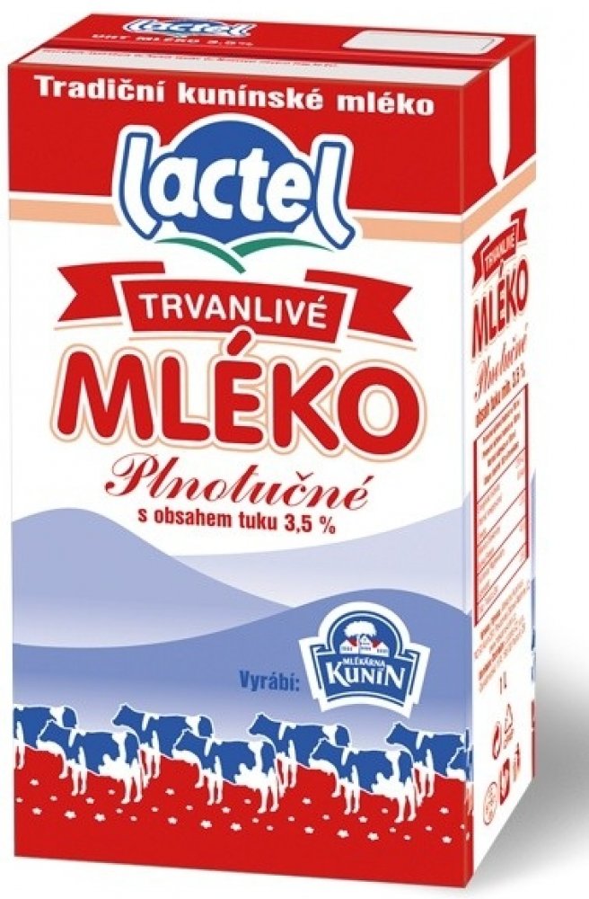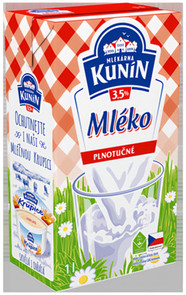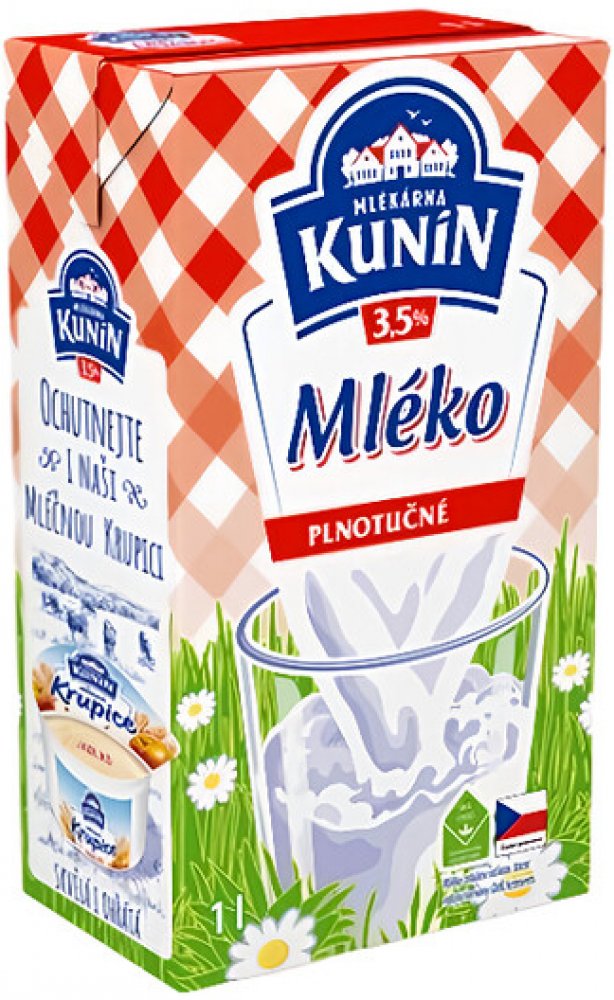 -- KUNÍN MLÉKO TRV.3,5% 1l 12x na 100 mlEnergie 270 kJ / 65 kcal, Tuky 3,5 g z toho nasycené mastné kyseliny 2,5 g, Sacharidy 4,8 g, z toho cukry 4,8 g, Bílkoviny 3,3 g, Sůl 0,13 g, Vitamin D 0,75 µg (15 % RHP), Vápník 120 mg (15 % RHP)