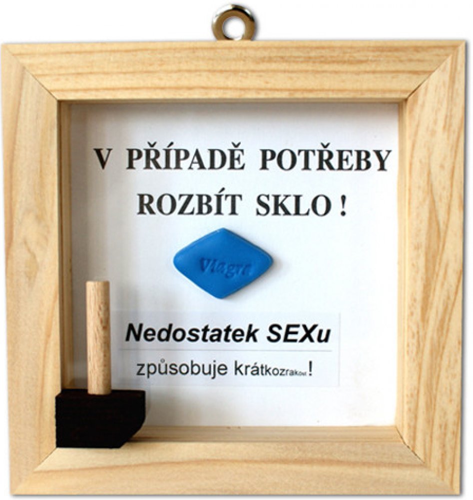 Obrázek První pomoc - Viagra muž je vhodný jako dárek pro muže od 18 do 90 let. Rám je vyroben ze dřeva a imitace viagry je chráněna sklem, které se dá rozbít připraveným malým kladívkem. Obrázek zároveň obsahuje text "Nedostatek sexu způsobuje krátkozrakost!". Vtipný dárek pro každého souseda, kamaráda či kolegu.