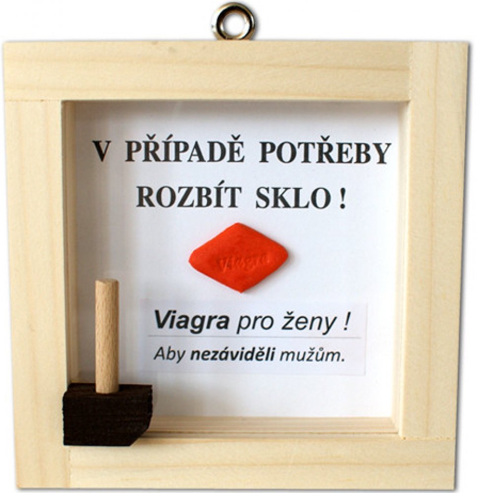 Obrázek První pomoc - Viagra žena je vhodný jako dárek pro ženu od 18 do 90 let. Rám je vyroben ze dřeva a imitace viagry je chráněna sklem, které se dá rozbít připraveným malým kladívkem. Obrázek zároveň obsahuje text "Viagra pro ženy! Aby nezáviděli mužům." Vtipný dárek pro každou sousedku, kamarádku či kolegyni.