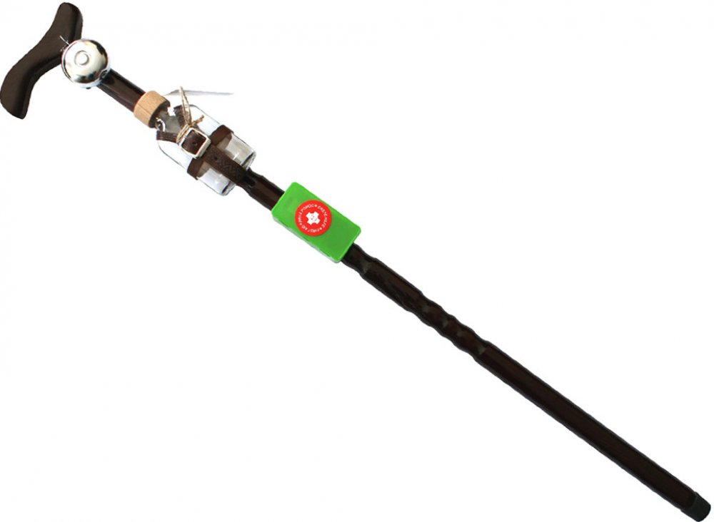 Vycházková hůl se zvonkem a láhví II je kvalitní dřevěná špacířka pro seniory vybavená zvonkem, láhví a krabičkou první pomoci, která obsahuje kondom a cigaretu se zápalkami. Hůl je vyrobena z bambusového dřeva s vyřezávanými ornamenty, povrch je lakován.