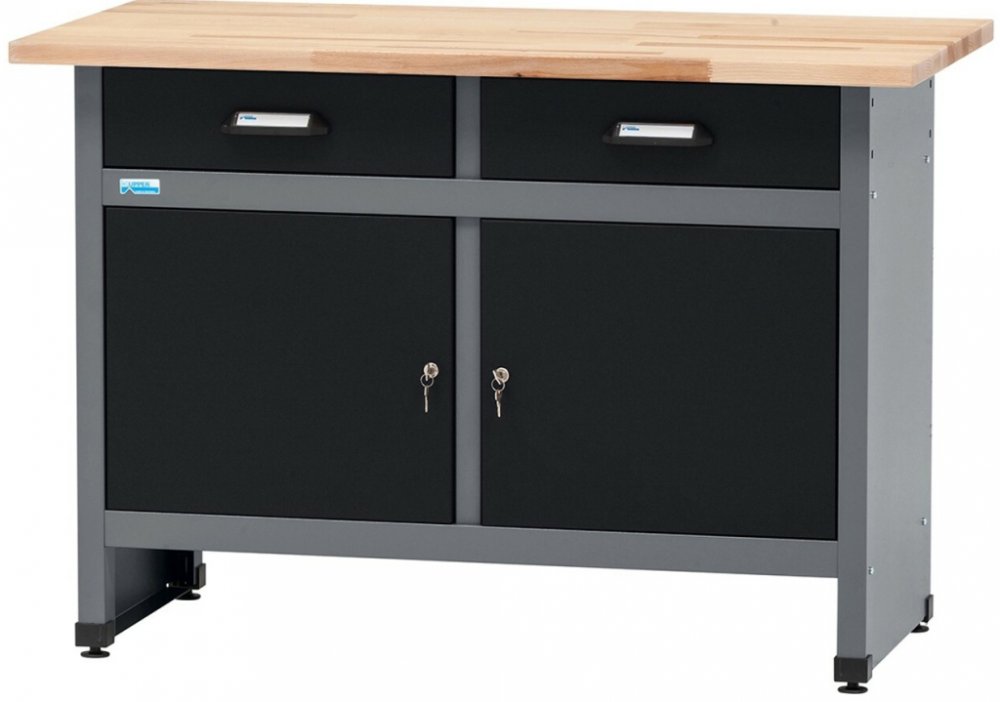 Tento odkládací dílenský stolek Küpper je vybaven 2 zamykatelnými dvířky a 2 zásuvkami o výšce 12 cm. Maximální nosnost stolku je 160 kg. Zamykatelná dvířka jsou dodávána včetně náhradního klíče, pro úschovu hodnotných předmětů a nářadí. Zásuvky jsou vybaveny vodícími kolečky pro pohodlné vysouvání a trvale lehký chod, vč. zarážky proti úplnému vytažení. Nosnost zásuvky je maximálně 25 kg. Solidní madla zásuvek jsou vyrobena z umělé hmoty zpevněné skelným vláknem s popisovatelnou vložkou, díky které se postarají o přehled a pořádek na pracovišti. Stolek je opatřen masivní bukovou deskou o síle 30 mm se speciální úpravou proti deformaci. Přírodní olejový nátěr zvyšuje odolnost proti znečištění. Pro vyrovnání nerovností podlahy má stolek výškově nastavitelné nohy do 3 cm. Küpper - systém s promyšlenými detaily a příslušenstvím Poctivá práce se vyplatí Nejlepší kvalita za přijatelnou cenu - za to ručí firma Friedrich Küpper GmbH. Již více než 85 let! Od svěráků až po kompletní dílenská zařízení do Vašeho domu či Vaší firmy - vše vyrobeno s velkou pečlivostí a vysokou užitkovou hodnotou v rámci garantovaného systému. Dobrá německá kvalitní práce s pečetí kvality ""Made in Germany"".