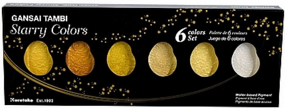 Gansai Tambi Starry Colors od Kuretake jsou akvarelové barvy, které obsahují pigment s metalickým pigmentem. Pro výtvarníky a profesionální umělce. Široké využití - ilustrace, písmomalířství a další...Sada obsahuje 6 hvězdných odstínů! Pro aktivaci barvy naneste malé množství vody. Popraskání barev nemá vliv na kvalitu. Textura barvy v kalíšku může vypadat hrubě, což je způsobeno mikroskopick...