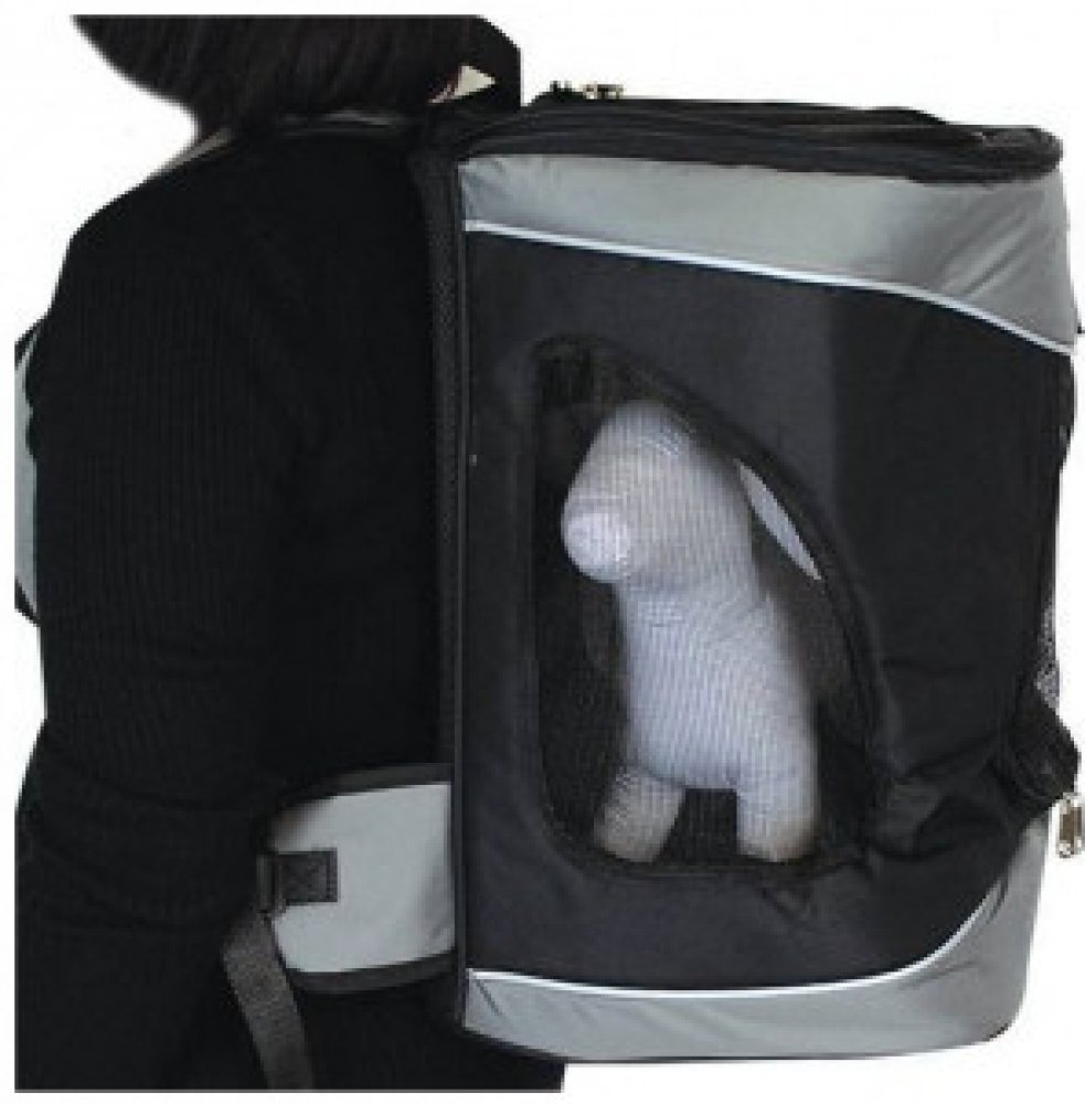 Polotuhý batoh pro psy v šedé a černé látce s velkým otvorem se zipem nahoře. Síťovaná ventilace na obou stranách. Popruhy jsou nastavitelné. Odnímatelné tuhé ploché dno. K zajištění větší tuhosti jsou k dispozici 2 tyčky. Umístěte je do prostor k tomu určenému uvnitř batohu na každé straně předního otvoru síťoviny. Složení: polyester / PVC. Barva: černá a šedá. Velikost: 35 x 30 x H 44cm.