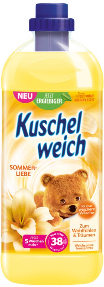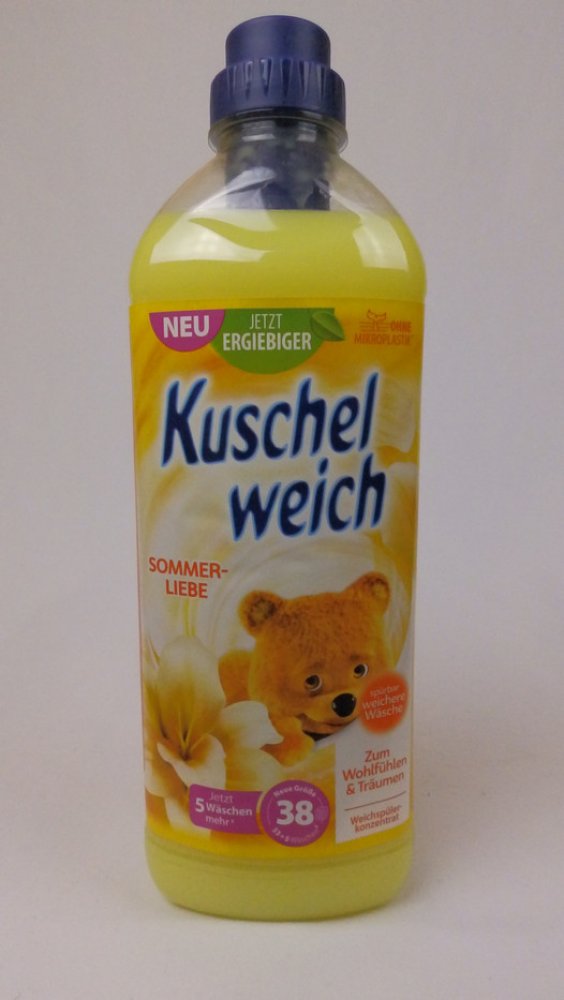 Kuschelweich aviváž 38 dávek Sommerliebe 1 l je koncentrovaná aviváž s překrásně svěží, letní romantickou vůní, která trvá dlouho po po vyprání. Kuschelweich je oblíbená německá silně koncentrovaná aviváž. Oblečení zanechává měkké na dotek a krásně vonící ještě dlouho po vyprání. Zabraňuje žmolkování a většímu zmačkání. Má antistatické účinky. Výrobek není dráždivý a může být použit na praní dětského oblečení. Jeho šetrné složení bylo dermatologicky testováno. Aviváž s přírodně svěží vůní s postupně se uvolňujícími parfémy. Přitulte se k měkkému letnímu objetí na vašem prádle. Jedinečné perly dávají prádlu svěží vůni po dlouhou dobu. Dopřejte si chvíle plné plyšového rozmazlování.POUŽITÍ:Přidejte do posledního máchání. Dávkování pro 4-5 kg prádla (pokud máte větší množství prádla, zvyšte dávkování): 26 ml pro měkké prádlo, 40 ml pro extra měkké prádlo. 15 ml do 10 litrů vody při ručním praní.SLOŽENÍ:viz Ingredients na výrobku. 5-15% kationtové povrchově aktivní látky.DOVOZ:NĚMECKO.UPOZORNĚNÍ:Upozornění: Uchovávejte mimo dosah dětí. Nebezpečí vážného poškození očí. Zamezte styku s kůží a očima. Při zasažení očí okamžitě důkladně vypláchněte vodou a vyhledejte lékařskou pomoc.ŽIVOTNÍ PROSTŘEDÍ:Zcela prázdný a důkladně čistý plastový obal lze recyklovat. Neodhazujte do volné přírody. Chraňte životní prostředí tříděním odpadu.