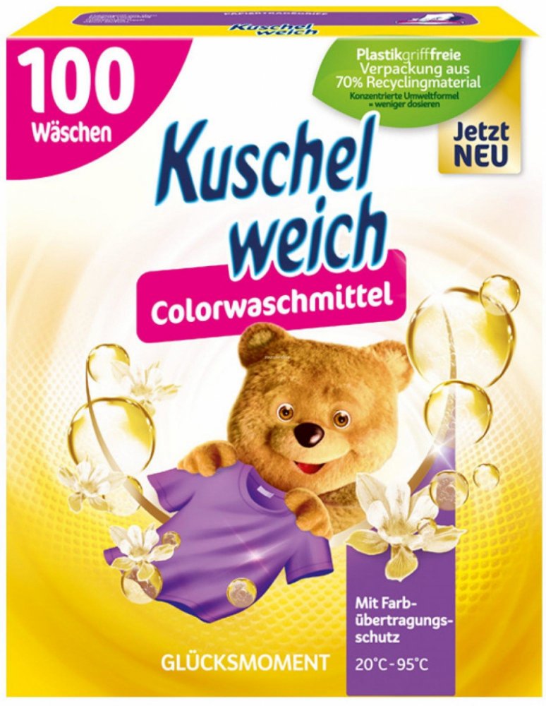 Německý Kuschelweich prací prášek 100 dávek Glücksmoment 5,5 kg pro vaše zářivé barevné prádlo s aktivní schopností odstraňovat skvrny od teploty praní 20 °C. Je šetrný k barvám a vláknům a bude vás hýčkat jemnou vůní štěstí. Pro měkké a zářivé prádlo. S úžasnou dlouhotrvající vůní, kterou si oblíbíte. Německá kvalita. POUŽITÍ:V případě praní v automatické pračce nasypte požadovanou dávku prášku (viz obal výrobku s dávkováním) do hlavního dávkovače pracího prostředku. V případě ručního praní nechte prášek rozpustit ve vodě, a poté prádlo důkladně vymáchejte.DOVOZ:Dovoz z Německa.SLOŽENÍ:Viz. zadní strana obalu: Inhaltsstoffangabe.UPOZORNĚNÍ:Způsobuje vážné podráždění očí. Držte mimo dosah dětí. Používejte ochranu očí. PŘI ZASAŽENÍ OČÍ: Několik minut opatrně vyplachujte vodou. Pokud podráždění očí přetrvává: Vyhledejte lékařskou pomoc / ošetření. Pokud je nutná lékařská pomoc, připravte si nádobu nebo štítek.ŽIVOTNÍ PROSTŘEDÍ:Důkladně čistý a prázdný obal je možné recyklovat. Neodhazujte výrobek ani obal do volné přírody.