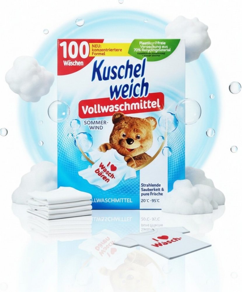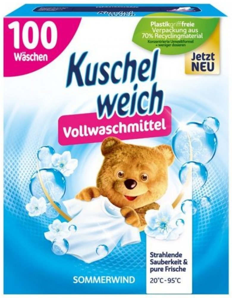 Prací prášek Kuschelweich je určen na bílé i barevné prádlo. Účinně odstraňuje skvrny již od 20 °C. Je šetrný k vláknům oděvů a zanechává prádlo měkké a dlouhodobě provoněné. Složení je na 100 pracích dávek.