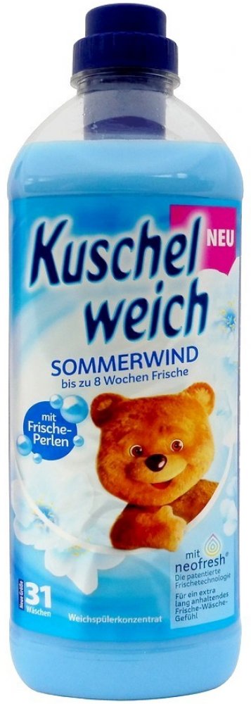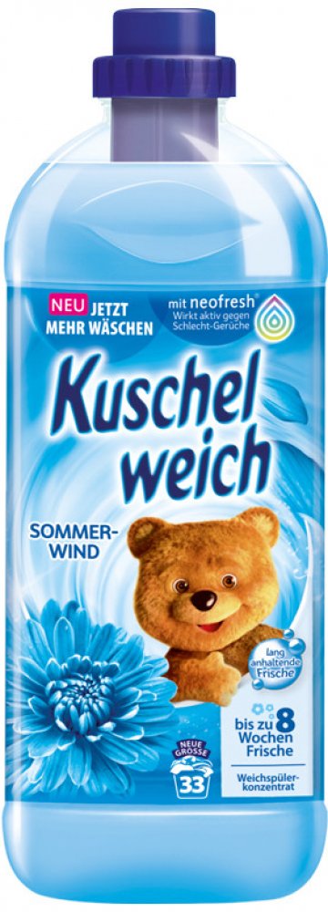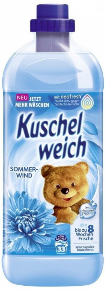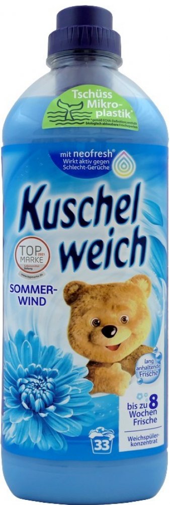 Kuschelweich aviváž 1 L - 38 PD Sommerwind v modrém provedení je německý, silně koncentrovaný avivážní přípravek určený pro měkké, příjemně vonící prádlo po dlouhou dobu. Díky koncentrované receptuře postačí menší množství pro skvělé výsledky: měkkost na dotek, snížené žmolkování a méně pomačkání, což oceníte u každodenní i jemné péče o textilie.