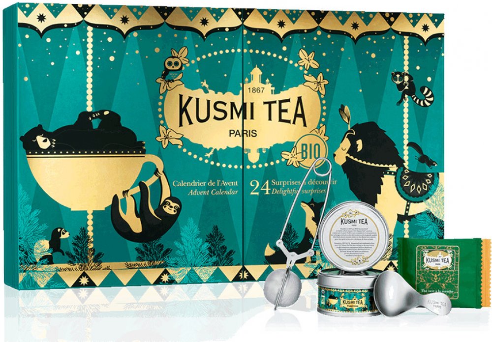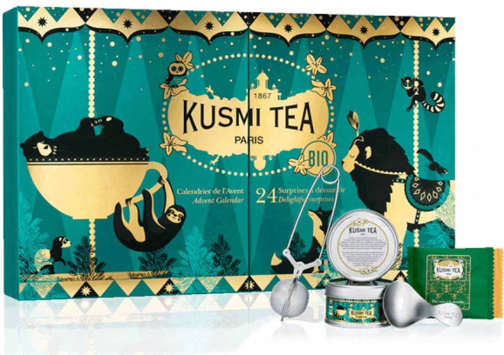 Adventní kalendář plný lahodných čajových překvapení. Objevte oblíbený adventní kalendář Kusmi Tea a zpříjemněte si každý adventní den rozbalením lahodného překvapení a užívejte si sváteční atmosféru. Rozkládací zeleno-zlatý adventní kalendář je dekorován okouzlující pouťovou scénu. Každé z 24 okének ukrývá jednu z našich ikonických čajových směsí. To ale není všechno! Otevřete je a odhalte balené čajové sáčky, miniatury se sypaným čajem, ale i čajové příslušenství tolik potřebné pro váš čajový rituál. Udělejte si radost a dopřejte si lahodné čajové kreace Kusmi Tea, nebo zpříjemněte advent svým přátelům a blízkým. Uhádnete, jaký čaj se ukrývá v posledním okénku? Potřebujete malou nápovědu? Je to speciální balení exkluzivního vánočního čaje od Kusmi Tea!Spoiler alert: prosím, nečtěte dále, pokud nechcete přijít o překvapení při otevírání okének.Set obsahuje: - 20 individuálně balených čajových sáčků: Anastasia, Darjeeling N°37, Earl Grey, English Breakfast, Russian Morning N°24, Lovely Morning, Jasmin green tea, Spearmint green tea, bílý čaj Alain Ducasse, Tropical White, White Anastasia, AquaRosa, AquaSummer, Feel Zen, Happy Mind, Lovely Night, Only Spices, mandlový Rooibos, vanilkový Rooibos, Sweet Break- Dvě čajové miniatury (malé kovové dózy se sypaným čajem): AquaExotica a Tsarevna - Dvě čajová příslušenství: čajovou lžičku (na odměřování potřebného množství čaje na 1 šálek) a čajové sítko na sypaný čaj.