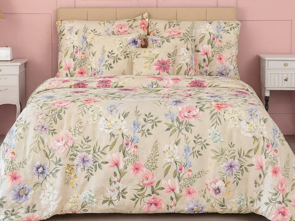 Saténové povlečení Botanica elegance působí jako romantická letní zahrada. Na jemném béžovém podkladu se rozvíjí bohatý vzor květin v pestré paletě odstínů růžové, červené, fialové, modré, žluté i bílé, vše v harmonickém souladu.
