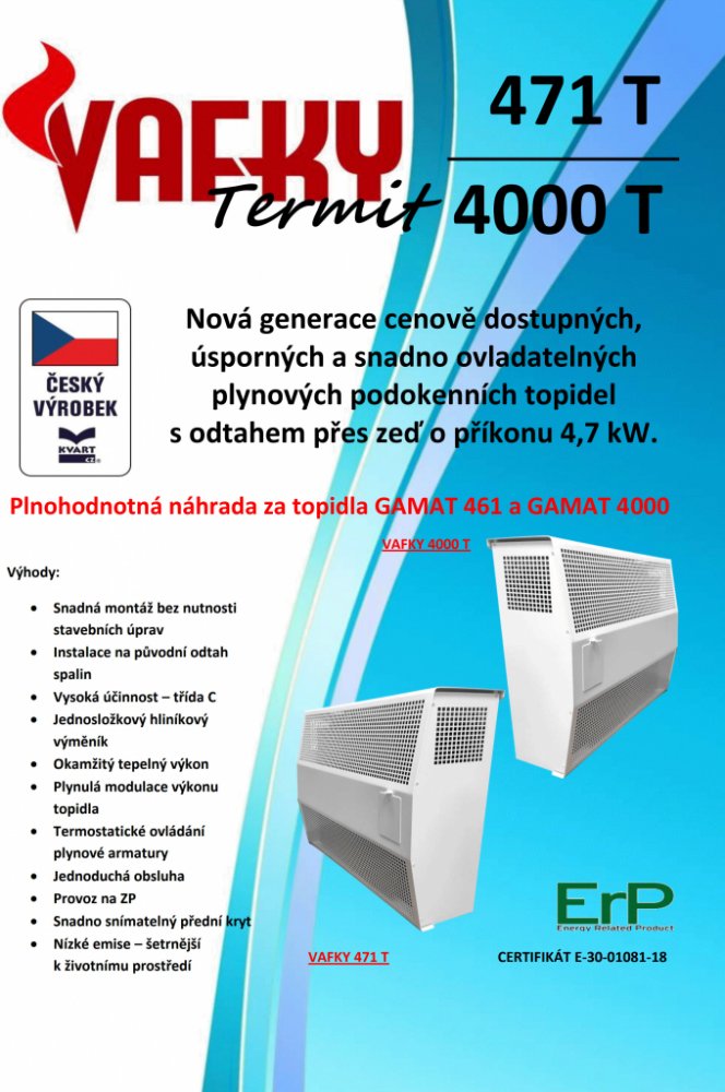 Plynové podokenní topidlo VAFKY 4000 T - cenově nejdostupnější přímá náhrada za topidlo GAMAT 4000 - s hliníkovým výměníkem, díky kterému má topidlo vyšší účinnost (tedy nižší spotřebu plynu) a tichý chod.
