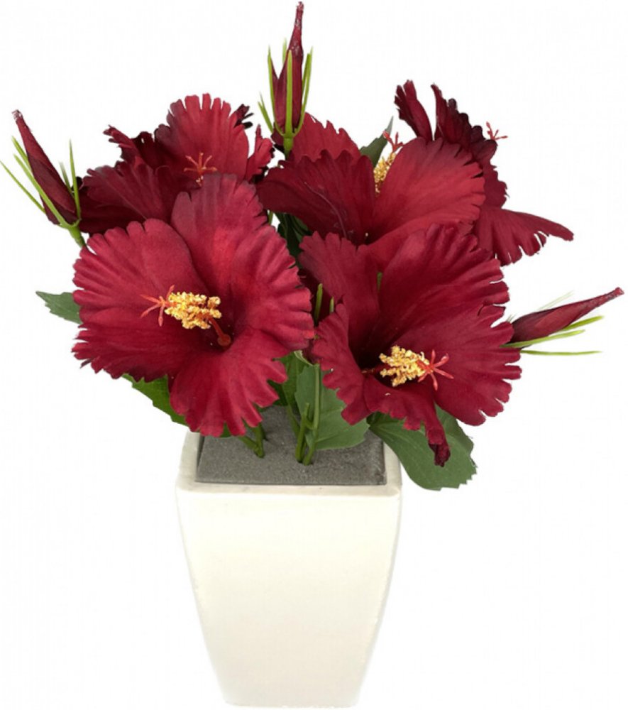 Umělá květina imitující ibišek. Vhodná na aranžmá či jako přízdoba. Aranžovaná v květináči. Materiál: textilie, plast. Velikost: 35 cm. Barva: červená.