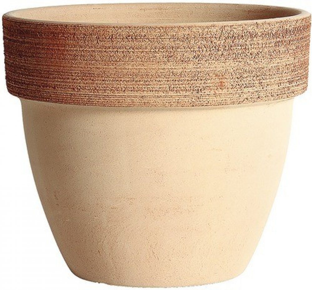 Keramický kónický terakotový květináč s vystouplým vyšším, v horní části tmavším a hrubším páskem, který se v horní části stává zároveň i lemem je jemně vypouklý. Používán pro výsadbu rostlin v interiéru i v exteriéru. Šířka: 20 cm, výška: 18 cm, hloubka: 20 cm. Vhodnou podmiskou je ARENA.