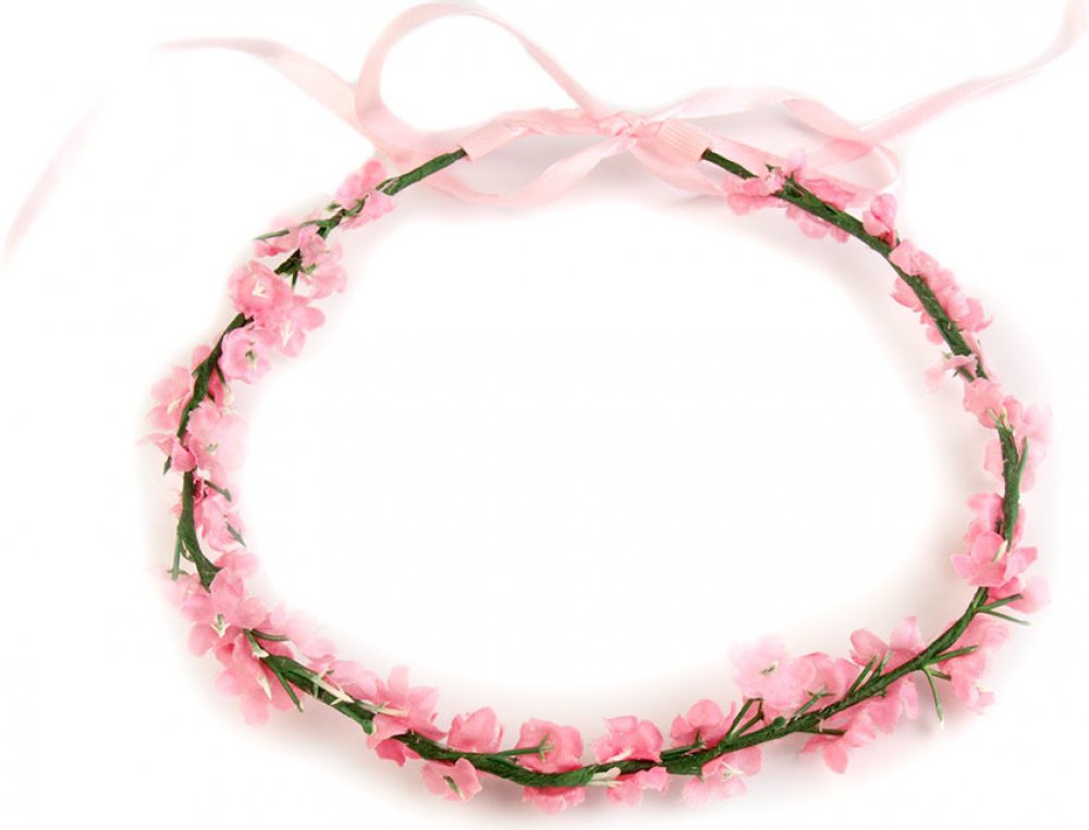 Romantický věneček s květy můžete nosit jako ozdobu vlasů nebo jej můžete použít k dekoračním účelům. Květy jsou připevněné k drátěné kostře, která je obalená papírem. Díky drátěnému základu můžete věneček tvarovat, velice příjemně se nosí. Vzadu si jej můžete mašlí zavázat na potřebnou velikost. Mašle působivě dozdobí zadní část hlavy.
